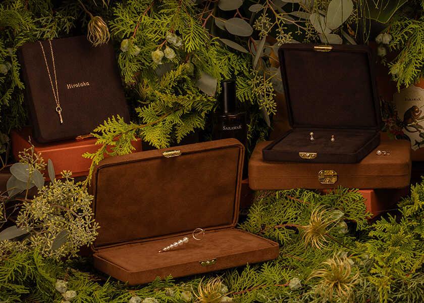 セットには、〈ヒロタカ〉オリジナルのジュエリーケースが付属。滑らかな質感とコンパクトなフォルムが特徴で、大切なジュエリーをエレガントに守ってくれる。