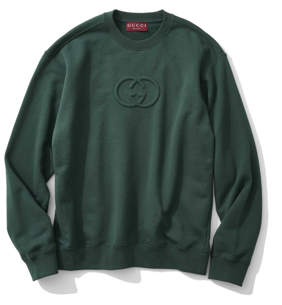 深みのあるグリーンと、起毛感のあるなめらかなブラッシュドコットン素材が、カジュアルなスウェットに品のよさを演出。さらに胸元の“インターロッキングG”のエンボスロゴが、格のある表情を添え、大人にふさわしいリッチな存在感を漂わせる。落ち着いた雰囲気とすっきりとしたシルエットで、ジャケットとのレイヤードもスタイリッシュに決まる。