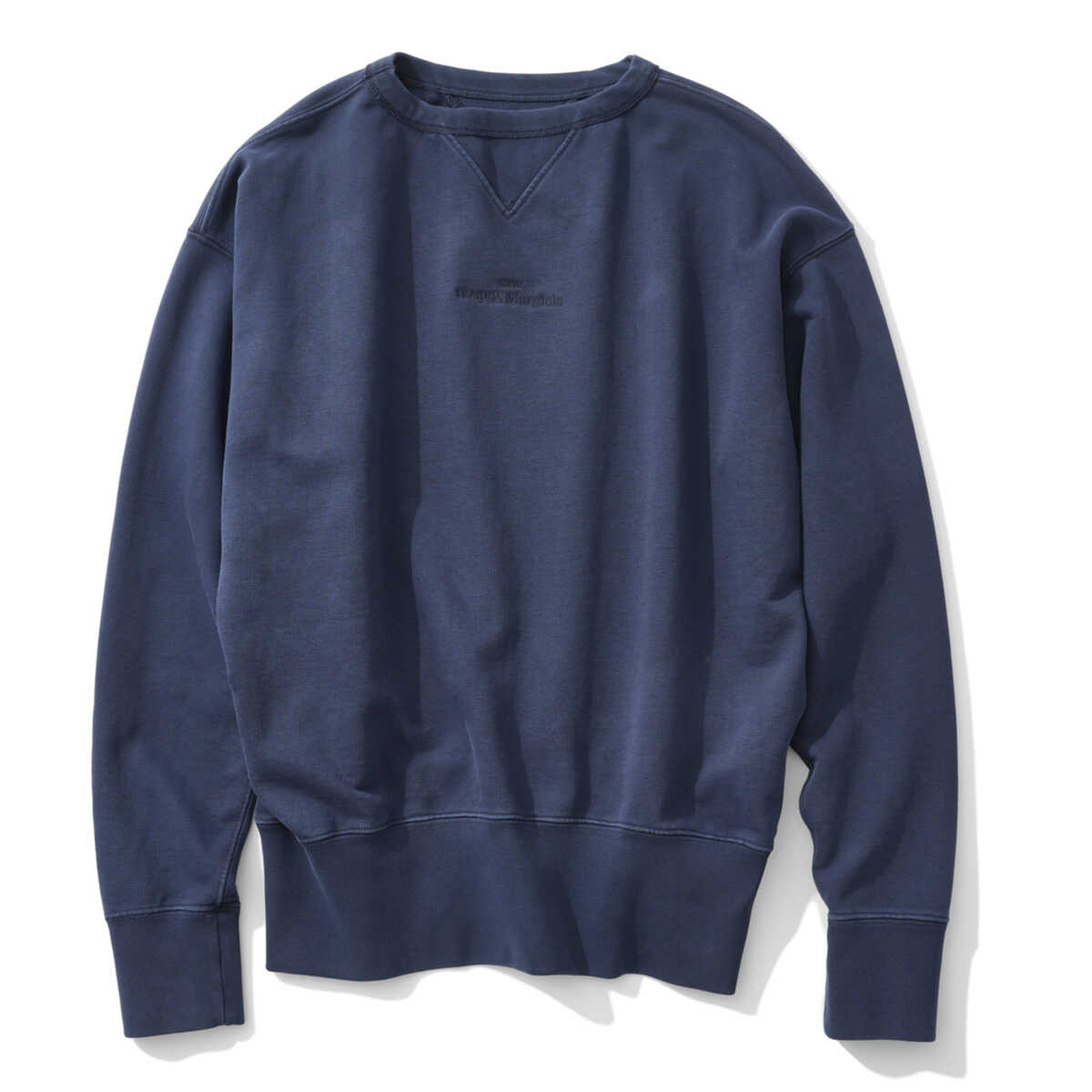 どこかプレッピーな雰囲気のあるネイビーのスウェットは、汎用性の高いクラシックな定番アイテム。さりげないフロントの刺繍ロゴや、バックにあしらったメゾンのシンボル、4本の白いステッチが映えるのも、シンプルなデザインあってこそ。ボディにはヴィンテージ加工を施し、こなれ感のある風合いを表現。袖口や裾には長めのリブにし、スポーティな要素を添えた。