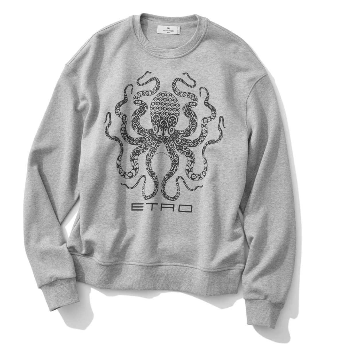 杢グレーのロゴ入りスウェットと聞けば、ベーシックなスタイルを思い浮かべるが、こちらはユニークなタコのモチーフがフロントに鎮座。ちなみにタコはミケーネ文明のシンボルであり、幸運への願いを込めたモチーフ。それをブランドを象徴するタペストリーパターンと表現することで、なんともアーティスティックな1着に仕上がっている。