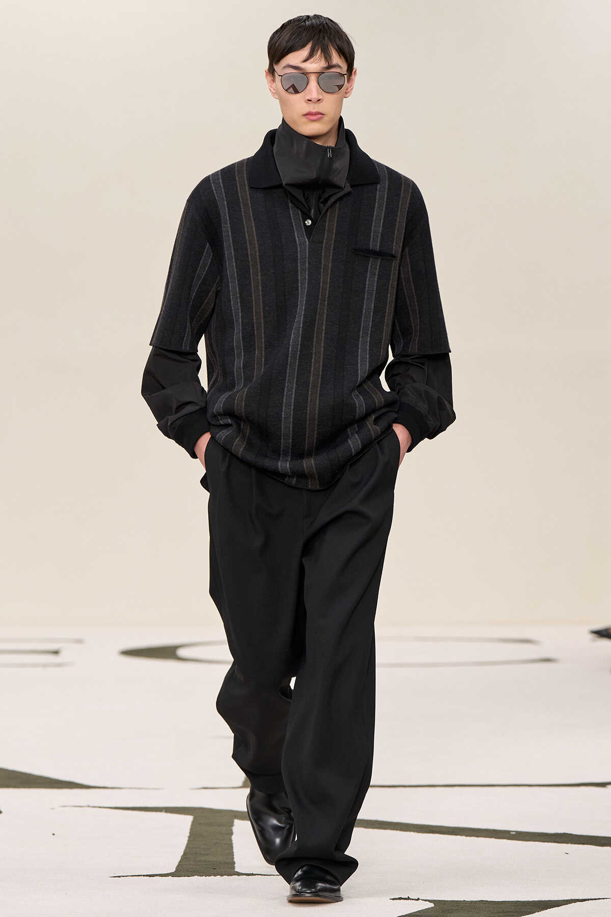 メリノウールストライプジャガードポロニット 18万7000円、ハイネックナイロンボンバージャケット 34万4300円、ウールダブルプリーツテーラードパンツ 18万7000円(以上カルバン・クライン コレクション/カルバン・クライン原宿フラッグシップストア)