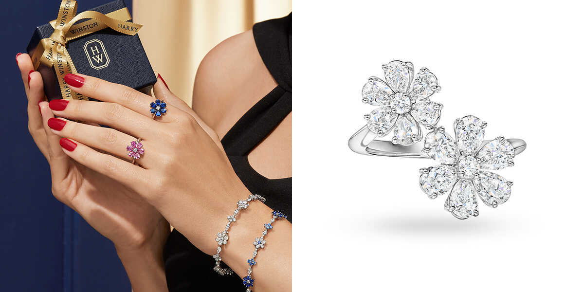 フォーゲット・ミー・ノット・リング(Pt×サファイア×ダイヤモンド)215万6000円、フォーゲット・ミー・ノット・リング(Pt×ピンクサファイア×ダイヤモンド)213万4000円、フォーゲット・ミー・ノット・ツインリング(Pt×ダイヤモンド)452万1000円、フォーゲット・ミー・ノット・ブレスレット(Pt×ダイヤモンド)1166万円、フォーゲット・ミー・ノット・ブレスレット(Pt×サファイア×ダイヤモンド)1030万7000円(各ハリー・ウィンストン/ハリー・ウィンストン クライアントインフォメーション)