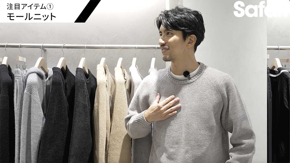 スタッフ池上(以下、池上) 「はい、今回オススメしたいのがモール糸を使ったニットですね。触っていただくとわかるんですが、モチモチ感があって、すごく着心地のいい1枚です。モール糸であえて毛羽を作っているのでタッチ感も滑らかなんです」