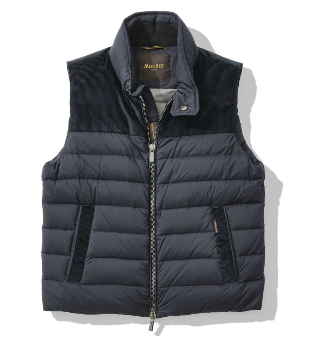 ストレートなシルエットにスタンドカラーと、すっきりスタイルアップが狙えるダウンベスト。ワントーンだがヨーク部分には光沢のあるコットンコーデュロイ素材をプラス。これが温かみのある表情を添えるだけでなく、超軽量のマットなダウンプルーフ生地との組み合わせにより、メリハリ出しにも効果的。また、スタンドカラーの内側にはフードが収納され、内側にもポケットを備えるなど機能性も申し分ナシ。
