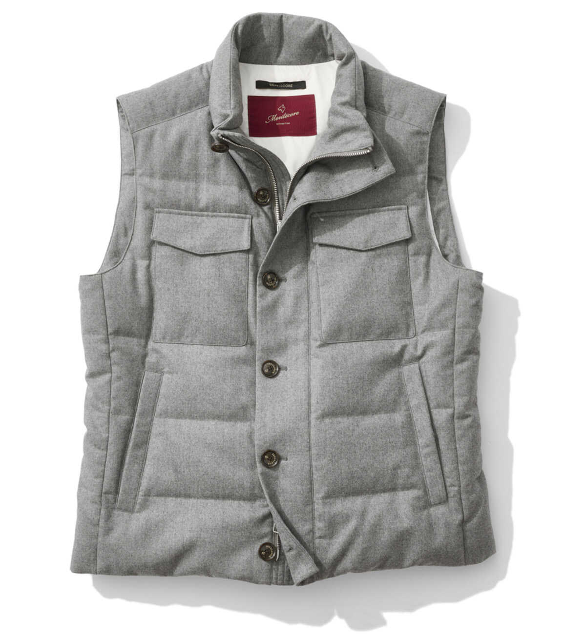 ウール100%のフランネル生地のダウンベストは、シックで品格のあるスタイルが魅力。ジェントルマンスタイルを体現したような洗練されたシルエットは、テーラリングの技術に定評のあるイタリアンブランドならでは。薄手で軽やかな着心地と同時に、スタンドカラーやフロントのダブルクロージャー仕様など高い保温性も備えており、スマートに冬のレイヤードコーデをこなせる。