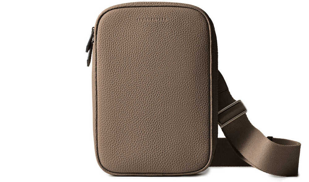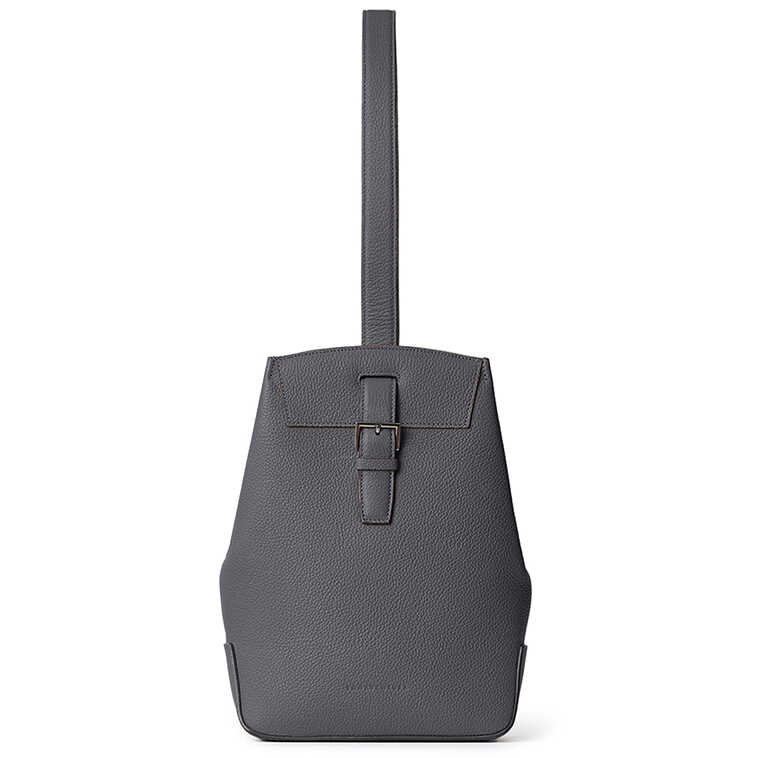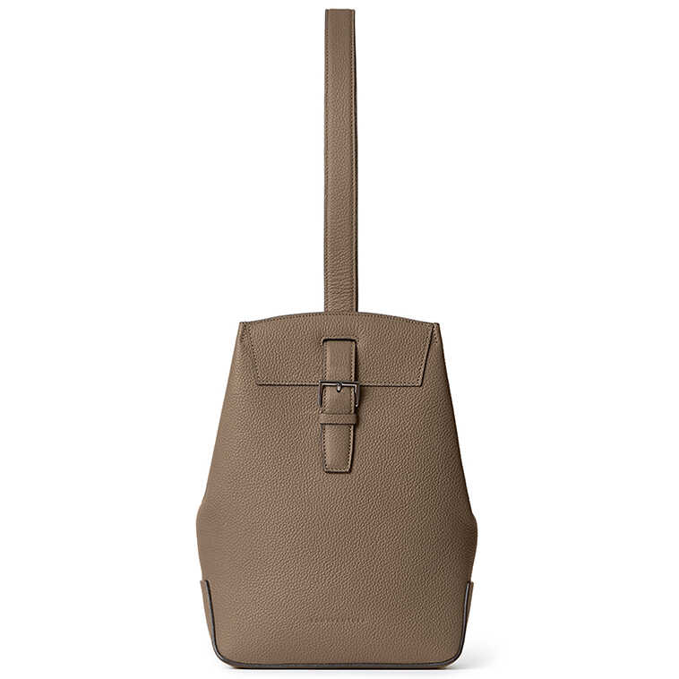 ハンドル持ちの2ウェイでの使用も可能。内側に携帯が収納できるポケット付き。カラーは松坂桃李着用のエトープ。他のカラーはチャコール、ブラック。シモーネ ワンショルダーバッグ シュリンクレザー W20×H27×D10㎝。16万9400円(ボナベンチュラ/ボナベンチュラ カスタマーサポート)