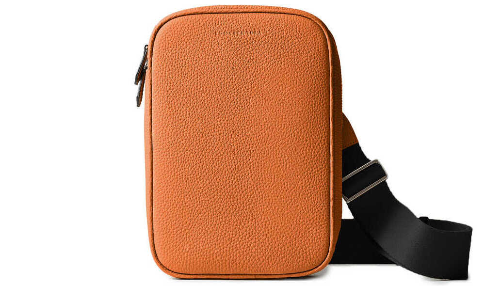ショルダーストラップの付け方で縦横2ウェイで使える。内側にはファスナー付きのポケットを装備。通常カラーは黒、エトープ、オレンジ他全8色。松坂さん着用のカラーは限定カラーのチョコレートブラウン。W15.2×H22.2×D5.5㎝。パオロ クロスボディバッグ シュリンクレザー 各12万3200円(以上ボナベンチュラ/ボナベンチュラ カスタマーサポート)バッグ選びでもコンパクト派の松坂桃李は、ほかの持ち物についても「数より質」を大切にしているように見える。