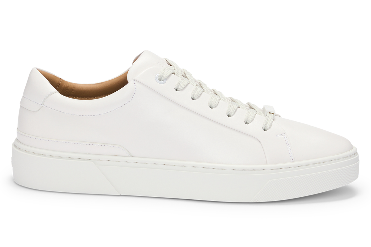 シンプルな外羽根式のテニススニーカータイプ。鳩目やステッチまでオールホワイトの仕様ながら、履き口の内側のみ薄いブラウンにしているので上品な見た目となっている。