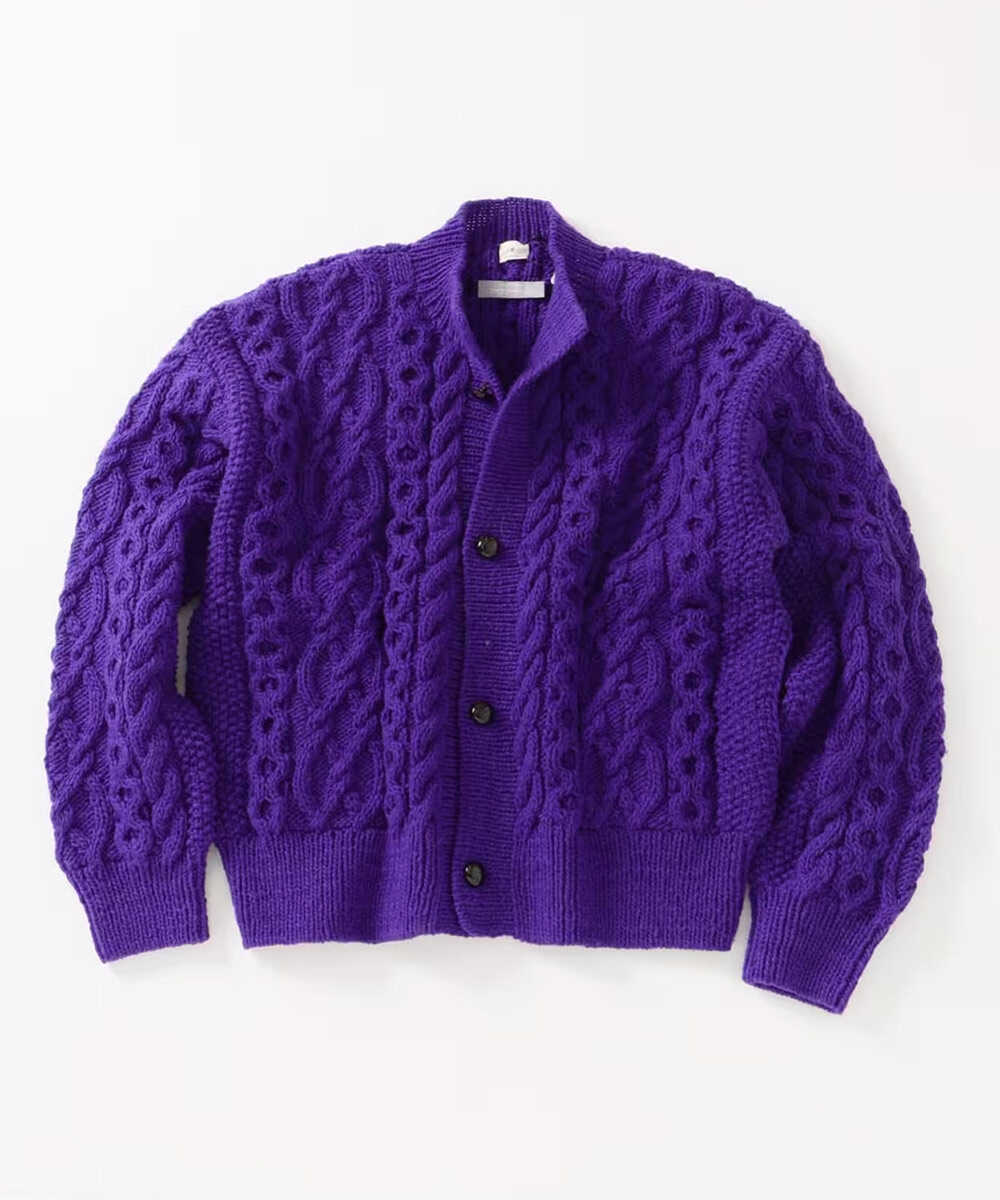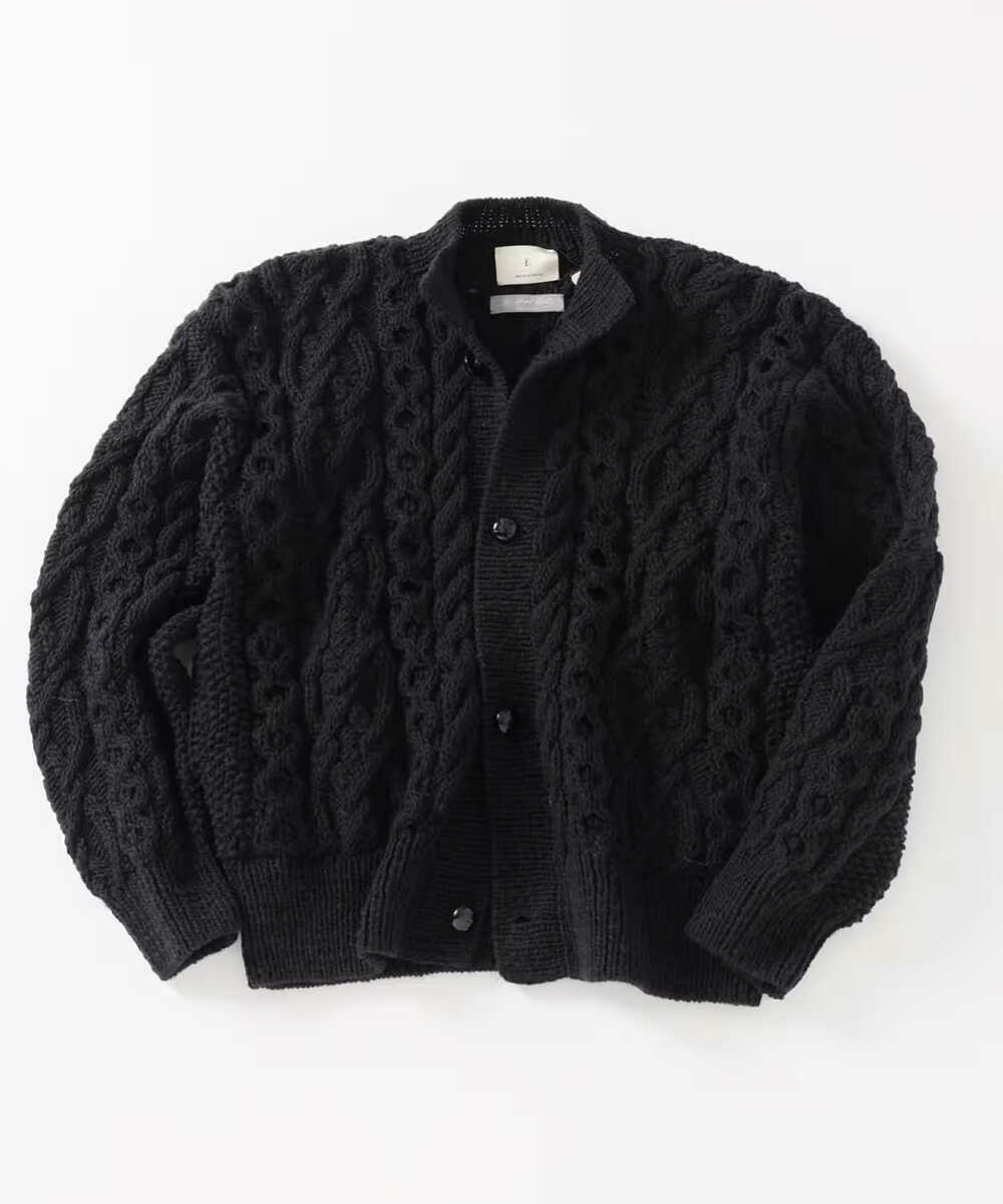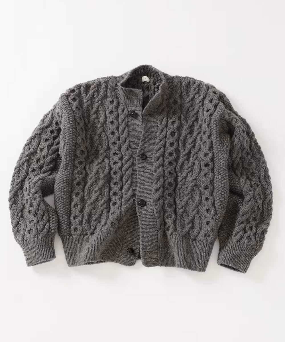 先ほどのニットガウンと同素材を採用した縄編みのカーディガン。手編みならではのクラフト感とふくらみある風合いが魅力的だ。オーバーサイズかつ、保温性も十分なのでアウターとしても役立つこと請け合い。
