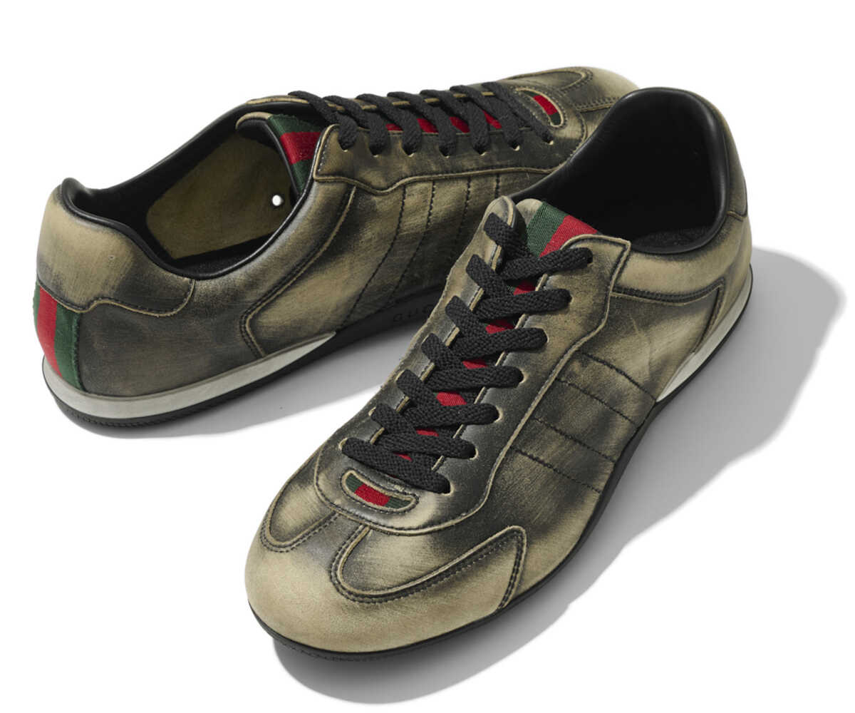 トレーナーシューズをこれまでと違ったアプローチで解釈し、超軽量デザインに仕上げた“グッチ シフト”。格上げポイントはなんといっても味な加工だ。まるでヴィンテージのような履き込み具合を表現し、ウェブ ストライプとのコントラストもあいまって、目を引く仕上がりに。