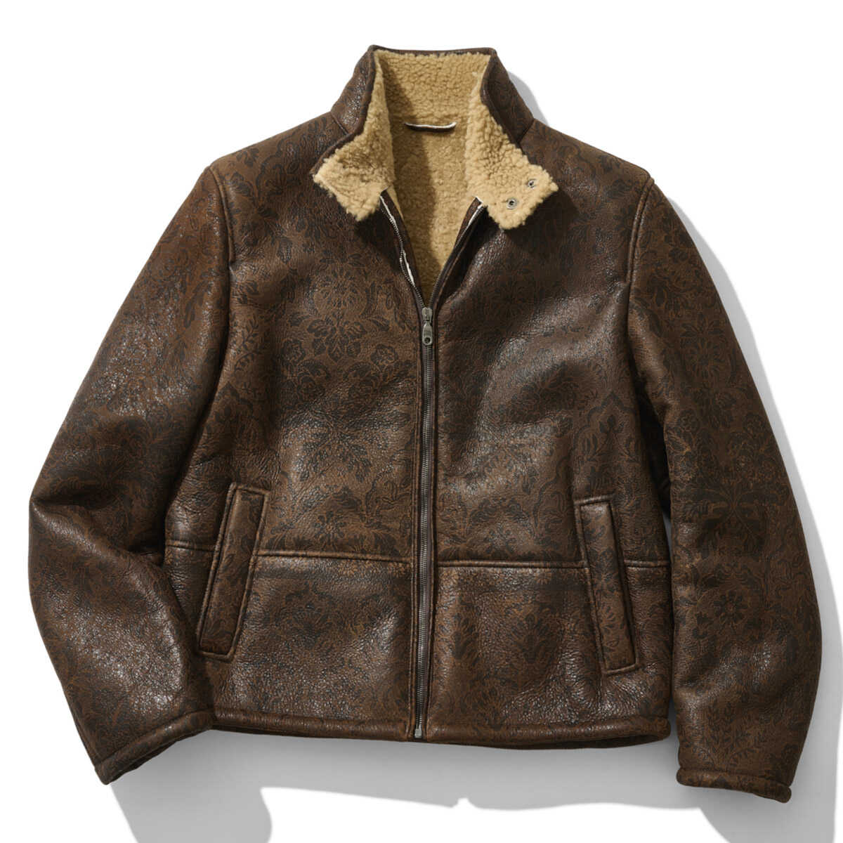 柔らかな質感が魅力の、シアリング素材を使ったレザージャケット。シボ感のある小慣れたレザーには、ぼかしを効かせたフローラル柄が全体にプリントされており、ユニークで洒落感のある個性を発揮してくれる。シンプルな着こなしにニュアンスを出すにも最適。首元のスナップボタンを全て留めるとタートルネックになり、すっきりとしたレザーコーデが楽しめるのも魅力。