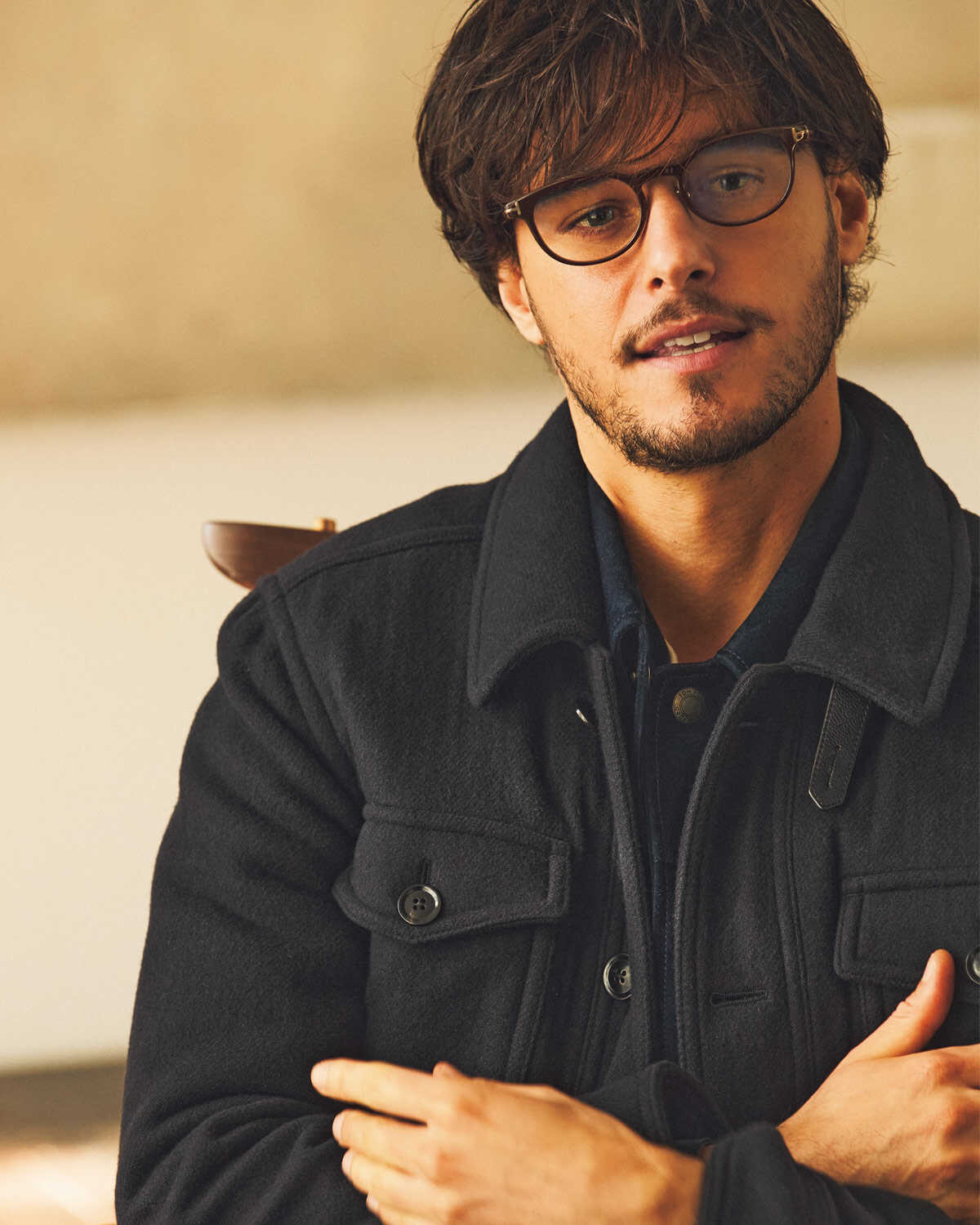 アイウエアとジャケットで“アズーロ・エ・マローネ”を構成。クラシカルなフレームも相まり、優しげで品を感じさせる装いに。眼鏡6万3800円(トム フォード アイウエア/トム フォード アイウエア カスタマーサービス)、ブルゾン84万1500円、中に着たスウェードジャケット142万1200円(以上トム フォード/トム フォード ジャパン)