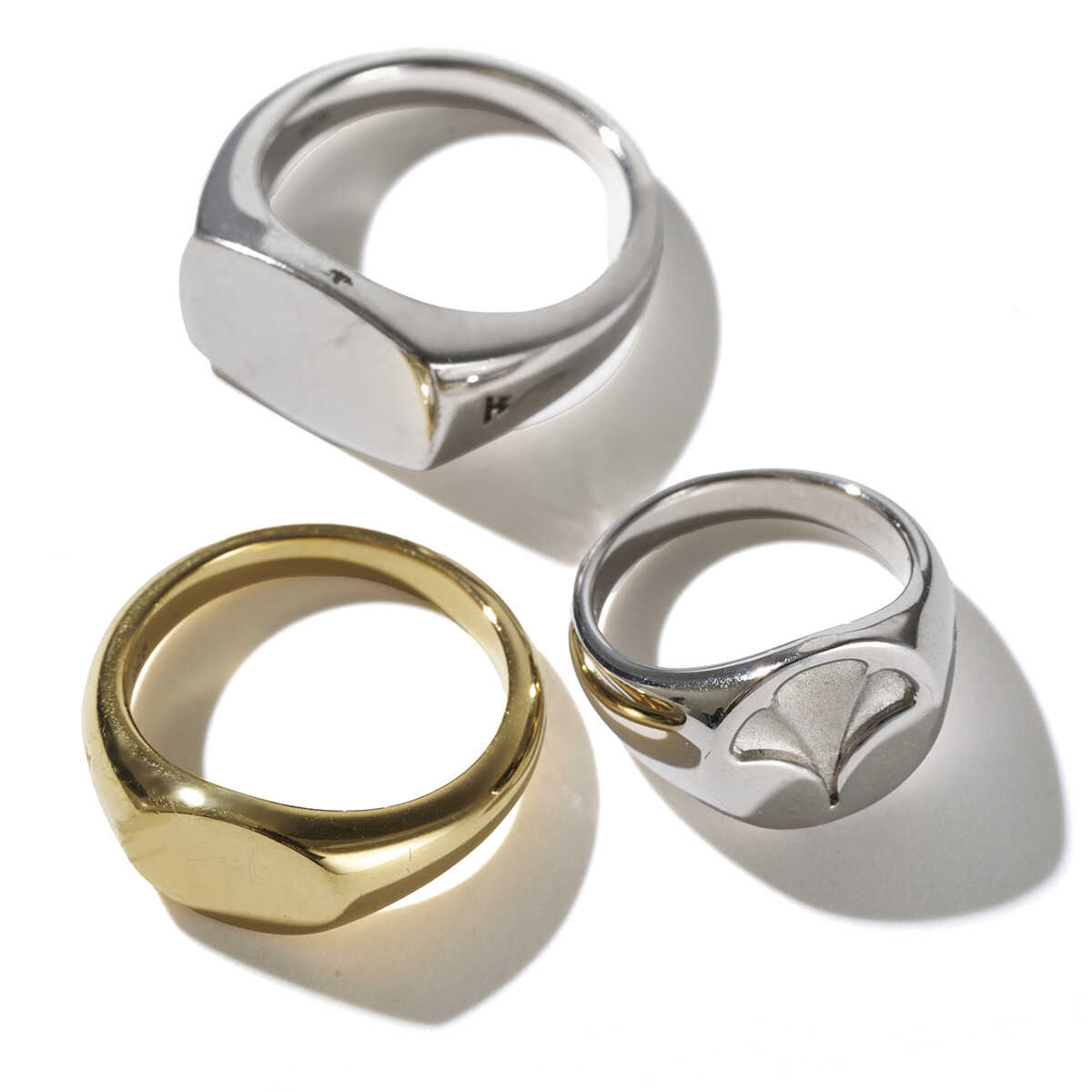 シグネットリングは、石付き以外にも様々なバリエーションがラインナップされる。上はスターリングシルバー925製、左下は9Kイエローゴールド、右下は東京へのオマージュとしてデザインされたもので、刻印は銀杏の木にインスパイアされたもの。青山の旗艦店が1周年を迎えた際、東京限定としてリリースされた。