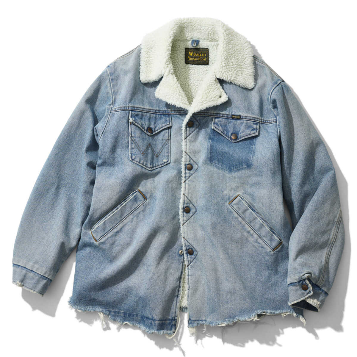 1970年代のランチコートをベースに、オリジナルのディテールを継承しながら、重ね着しやすいようにリサイズ。パーカと合わせたりTシャツの上からサッとラフに羽織るだけで、白ボアとヴィンテージ感のあるデニムの効果で、コーデにこなれた印象が漂う。素材には〈ラングラー〉の真骨頂ともいえるブロークンデニムを採用。破れに強い生地でありながら、柔らかな風合いもあり、着心地のよさも魅力。