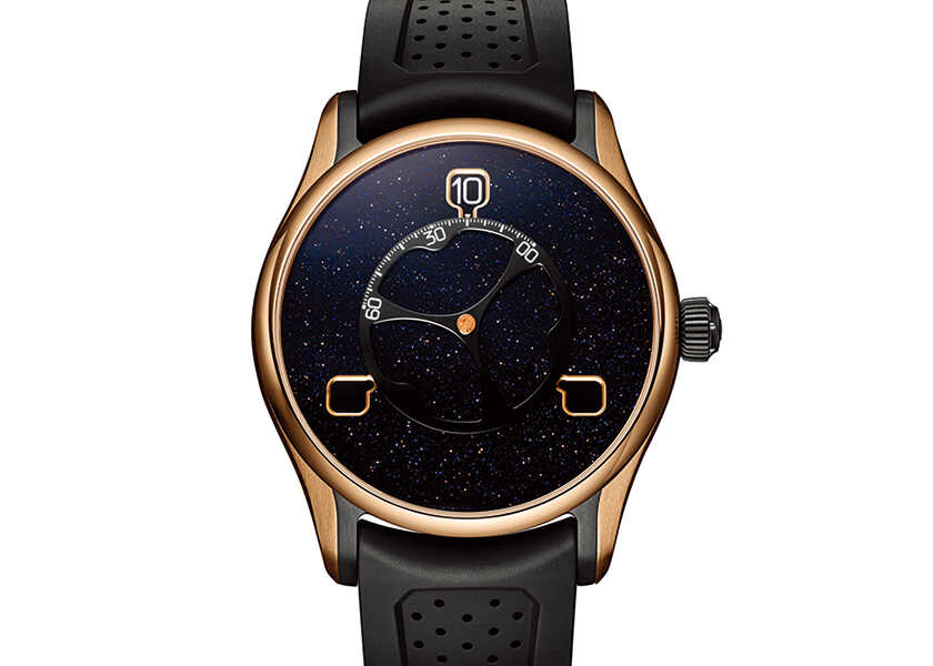 宇宙の衛星がテーマ。3つのディスクがそれぞれ自転しながら中央のミニッツディスクの周りを公転する独創的なフライングアワー機能を採用し、現代におけるウォッチメイキングの先進性を表現! 100本限定。ケース径42.8㎜、自動巻き、18KRG×チタンケース、ラバーストラップ、12気圧防水。751万3000円(H.モーザー/エグゼス)