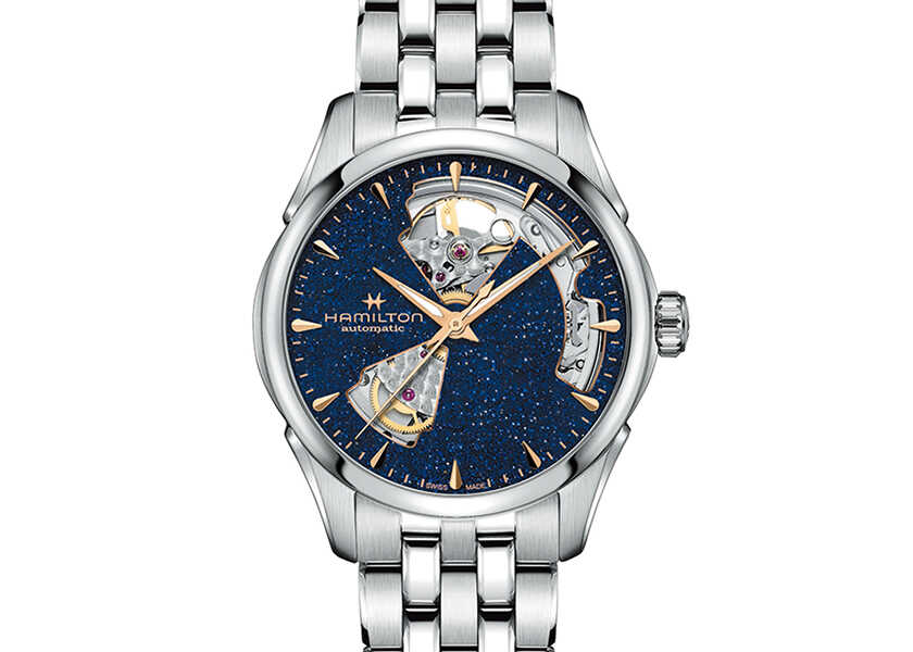 斬新なカッティングが施されたオープンハートデザインで、露出部分から機械的造形を強調。ムーブメントは耐磁性に優れ、標準持続時間は80時間を誇る。瞬く星々のようなアベンチュリン文字盤が印象的。ケース径42㎜、自動巻き、SSケース&ブレス、5気圧防水。16万6100円(ハミルトン/ハミルトン スウォッチ グループ ジャパン)