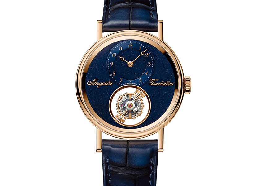 創立250周年の第四章を飾る、ブランド初となるフライングトゥールビヨンモデル。文字盤にはアベンチュリン装飾のグラン・フー・エナメルが採用され、星空を思わせる構成。世界限定50本。ケース径38㎜、手巻き、18Kブレゲゴールドケース、アリゲーターストラップ、3気圧防水。3196万6000円(ブレゲ/ブレゲ ブティック 銀座)
