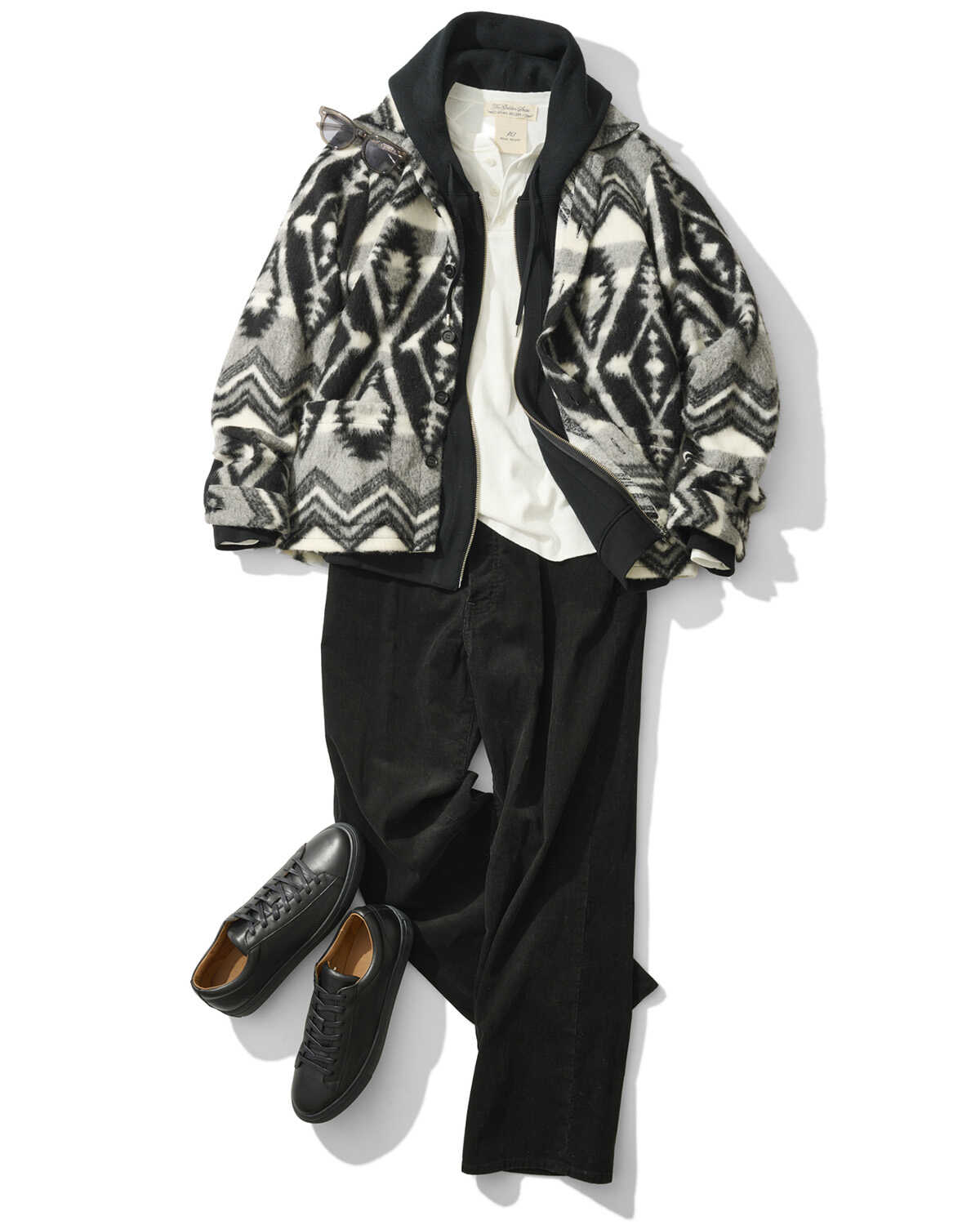 サーフボードと相性抜群なネイティブ柄のアウターを羽織り、こなれたコーデュロイパンツと合わせた海デートスタイル。インナーには白のヘンリーネックTで爽やかな抜け感と、ほんの少し大人の色気をプラス。そのままだと季節的に寒々しいのと、少し深みが足りないので、Tシャツとアウターの間には黒のニットパーカを挟み、着こなしに立体感を演出するのもお忘れなく。