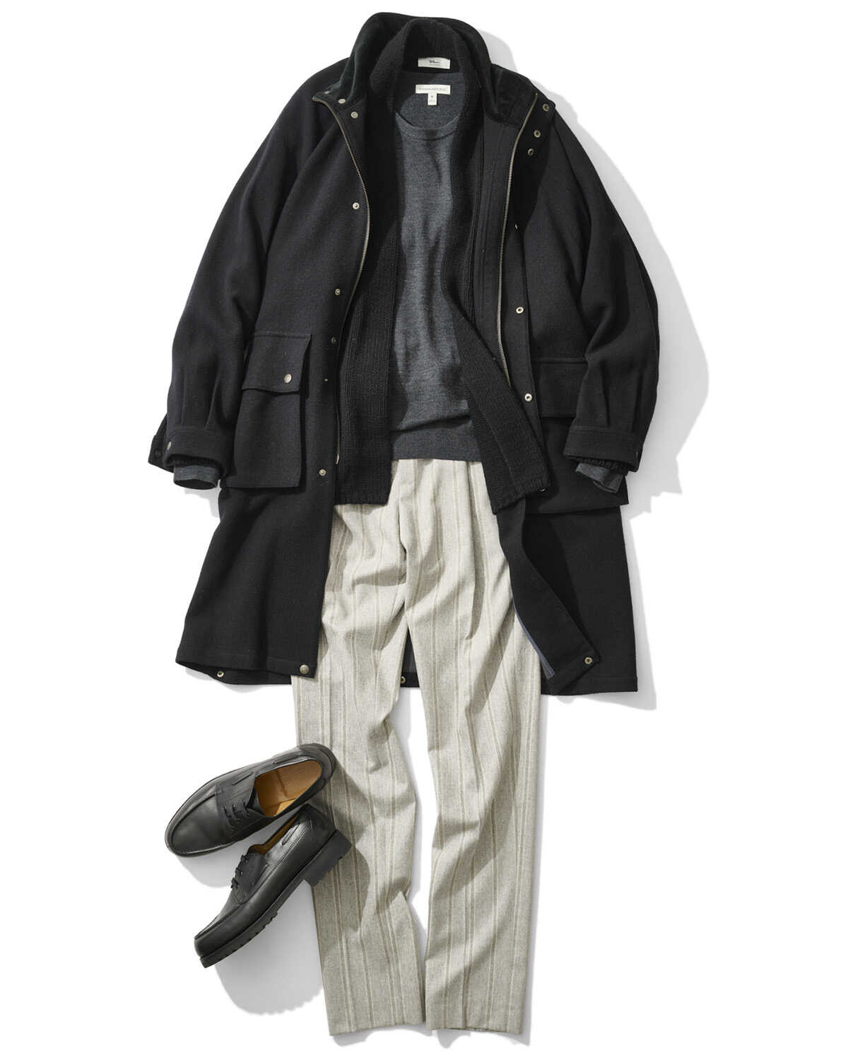 ゆるめのボタンレスカーデとハイゲージニットのレイヤードが、大人の余裕とこなれ感を漂わせたスタイリング。リラックスムードなニットレイヤードの上には、シックな黒のコートを重ね、スマートなシルエットを実現。トップとアウターはダークトーンでまとめているので、全体が重たく見えないようボトムは淡いグレーをセレクト。パンツのストライプ柄の効果で、ボトムもスラリと軽やかな印象に仕上がる。