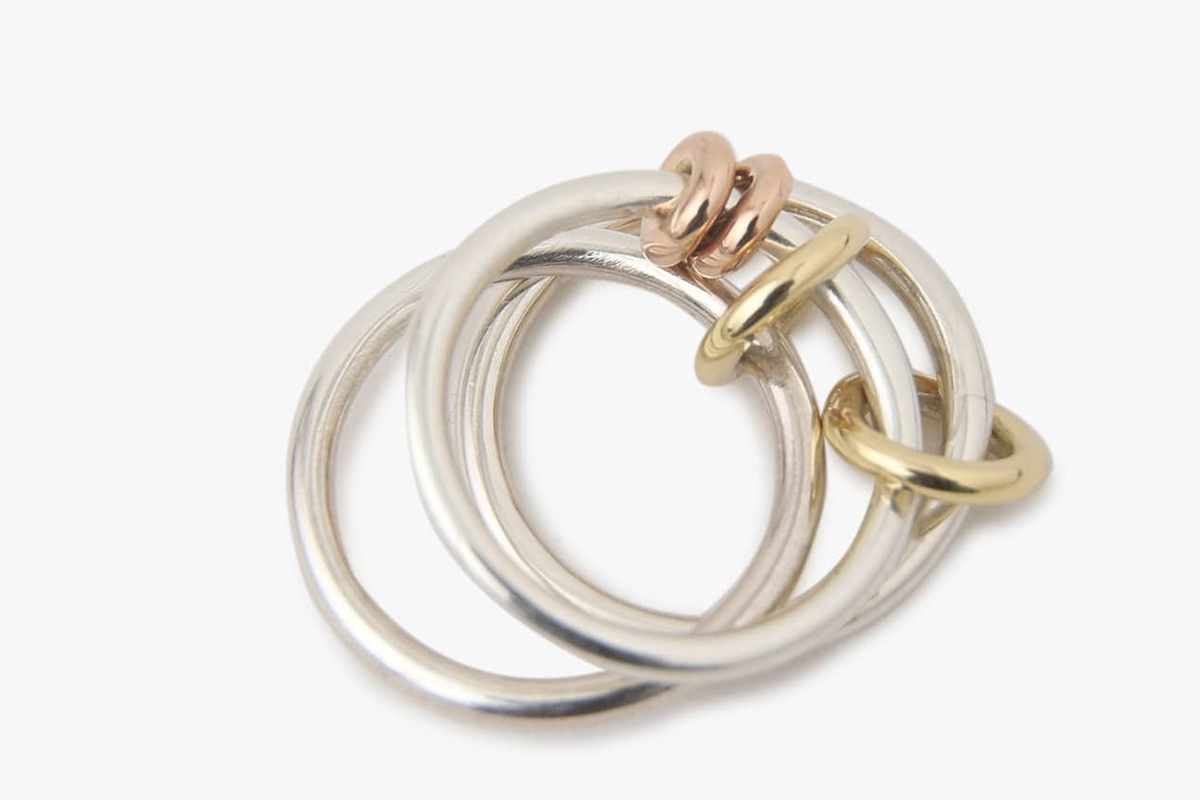 〈スピネリキルコリン〉は、2010年にデザイナーのイブ・スピネリが創立。〈ロンハーマン〉の出自であるLAを拠点にし、いずれもLAで1点ずつ職人によりハンドメイドされている。お目立ちしすぎないちょうどいいボリューム感とシルバーとゴールドを基調としたスタイリッシュさのバランスが絶妙。リングを繋げ、さらにリングを纏わすそのデザインは、ここでしか味わえないアーティステックさだ。シンプルなだけに、ひとつにとどまらず、いくつも身につけられるのも魅力。今回はその中からいくつかピックアップして紹介しよう。