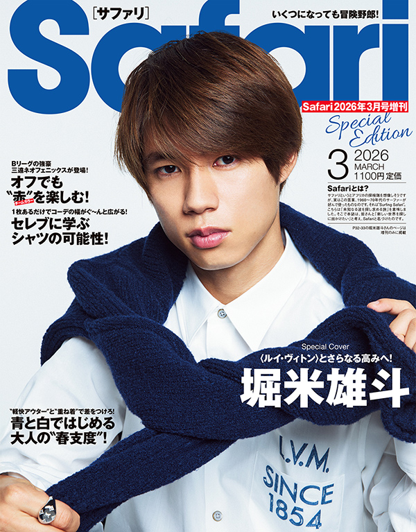 1月23日発売の『Safari』3月号では、スペシャル エディション版の表紙に堀米雄斗さんを迎えた。こちらも〈ルイ・ヴィトン〉をまとっての登場なので、是非手に取ってほしい。アクティブなスケートボード姿とはまた違う顔が見られること間違いない。