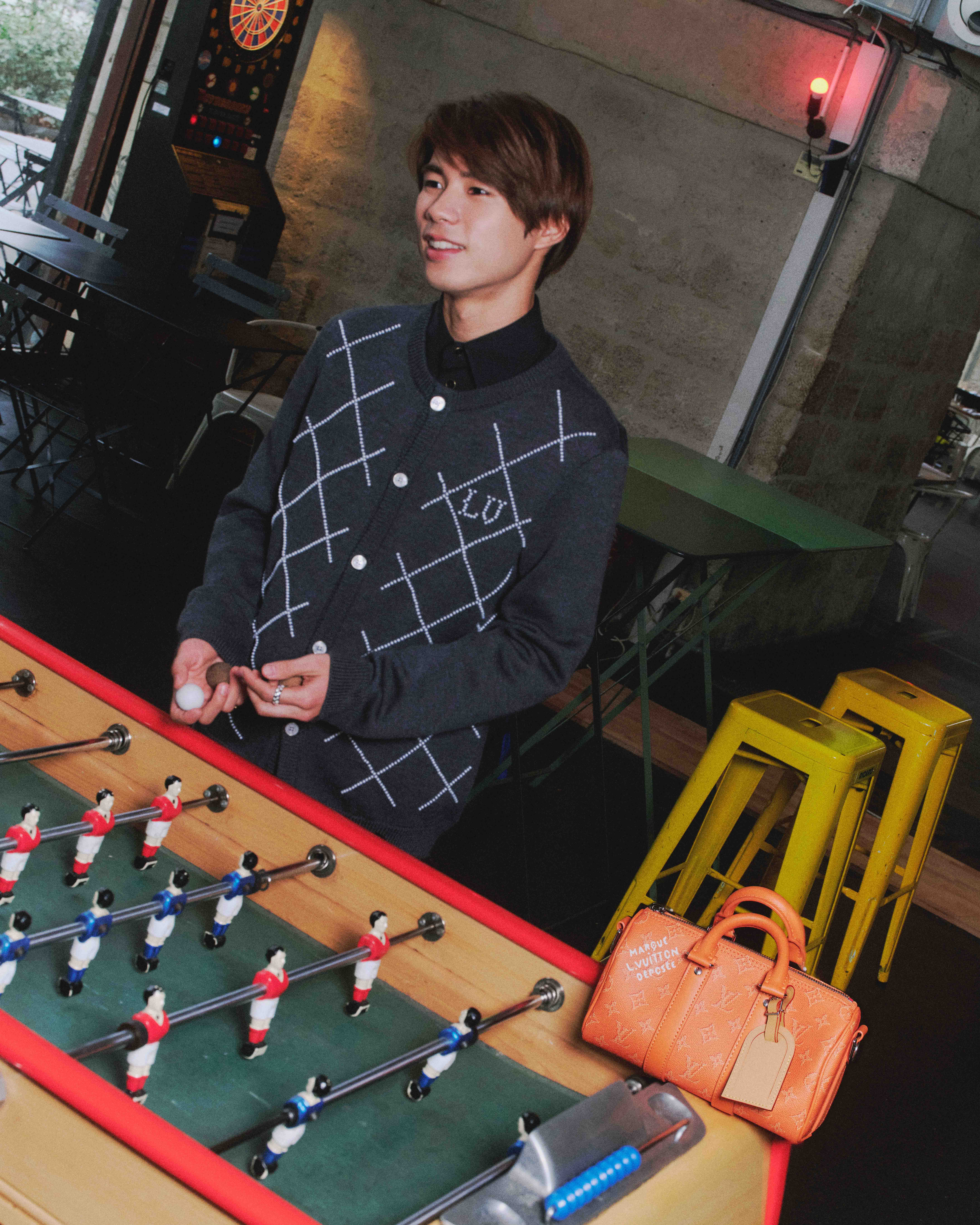 デニムシャツ72万500円、中に着たシャツ21万3400円、パンツ29万1500円、ネクタイ3万6300円、ブーツ21万6700円、バッグ“LV × ザ·ダージリン リミテッド ナイル GM”70万9500円、WG×ダイヤのリング“ル ダミエ ドゥ ルイ・ヴィトン”159万5000円、テーブルの上に置いた〈日本限定〉ウォレット“ジッピー・ウォレット ホリゾンタル”14万5200円、テーブルの上に置いたLV バーム“000 インフィニットドリーマー”2万3100円(以上ルイ・ヴィトン/ルイ・ヴィトン クライアントサービス)