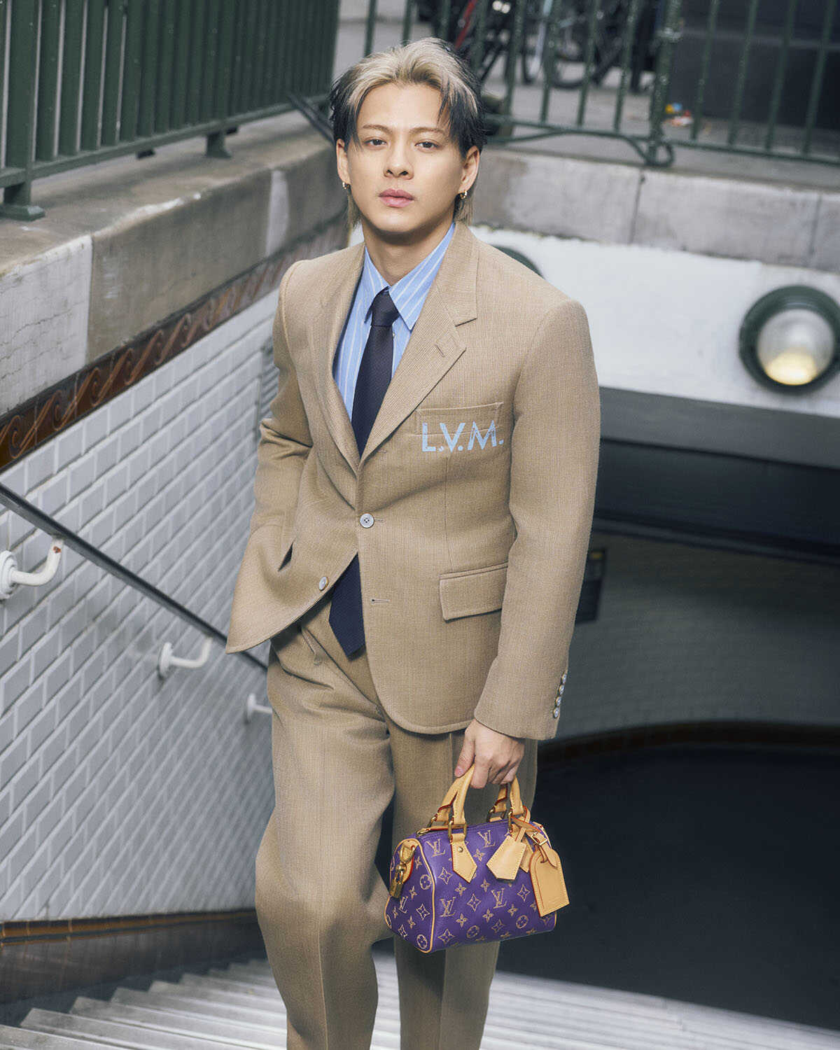ジャケット56万1000円、シャツ21万3400円、パンツ25万3000円、ネクタイ3万6300円、バッグ “スピーディ P9 バンドリエール 20”182万6000円、ピアス“ル ダミエ ドゥ ルイ・ヴィトン”77万円、YG×ダイヤのリング“ル ダミエ ドゥ ルイ・ヴィトン”151万8000円、WG×ダイヤのリング70万9500円(以上ルイ・ヴィトン/ルイ・ヴィトン クライアントサービス)