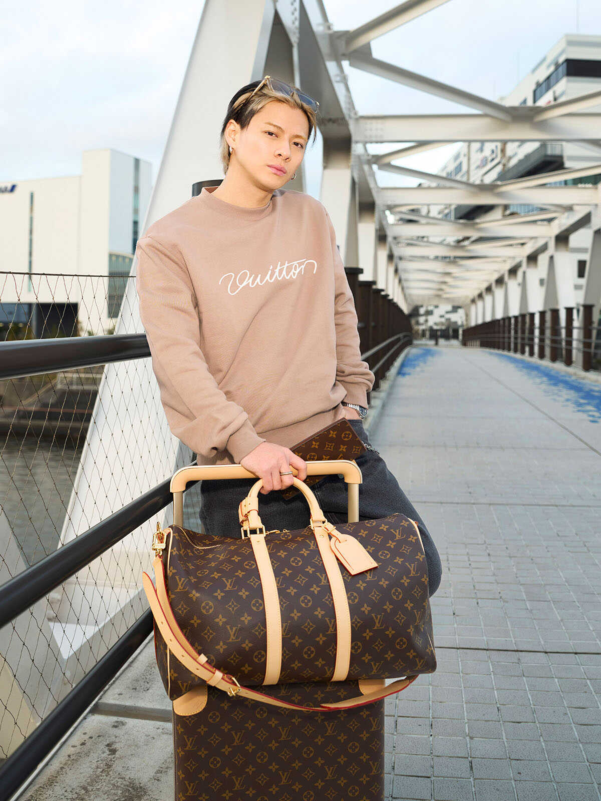 トップ17万8200円、パンツ19万2500円、スニーカー16万9400円、サングラス8万1400円、チェーンベルト14万8500円、ピアス〈単品〉5万1700円、リング6万1600円、ウォッチ“タンブール オトマティック スティール ブルー”317万9000円、バッグ“キーポル·バン ドリエール 45”41万4700円、スーツケース“ホライゾン 55”50万7100円、ウォレット“ポルトフォイユ·ブラザ”10万5600円(以上ルイ・ヴィトン/ルイ・ヴィトン クライアントサービス)