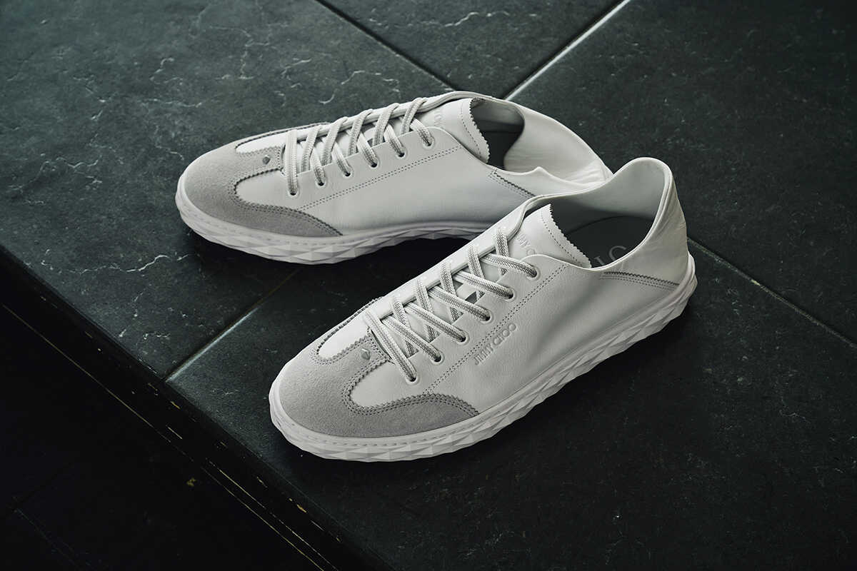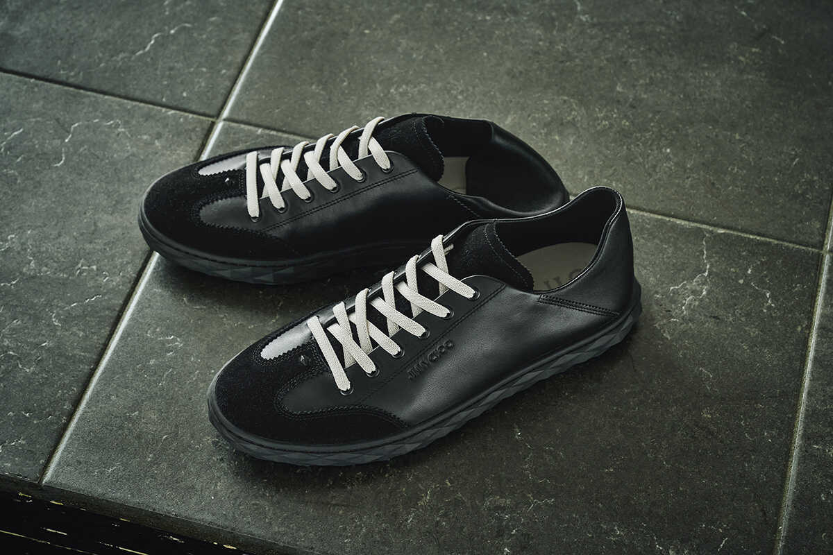 “ダイヤモンド フレックス”と名づけられたこちらのスニーカーは、“フレックス”というその名のとおり、足を優しく包み込むその柔らかな履き心地が秀逸。また踵部分を折り込んで履けるステップイン仕様なので、スリッポンやサンダル感覚でよりリラックスしたスタイルを楽しむことも可能だ。軽量なアウトソールの側面には、シグネチャーである“ダイヤモンド”のエンブレムを模したファセット加工が施され、〈ジミー チュウ〉らしいラグジュアリーなムードもさりげなく印象づけられる。