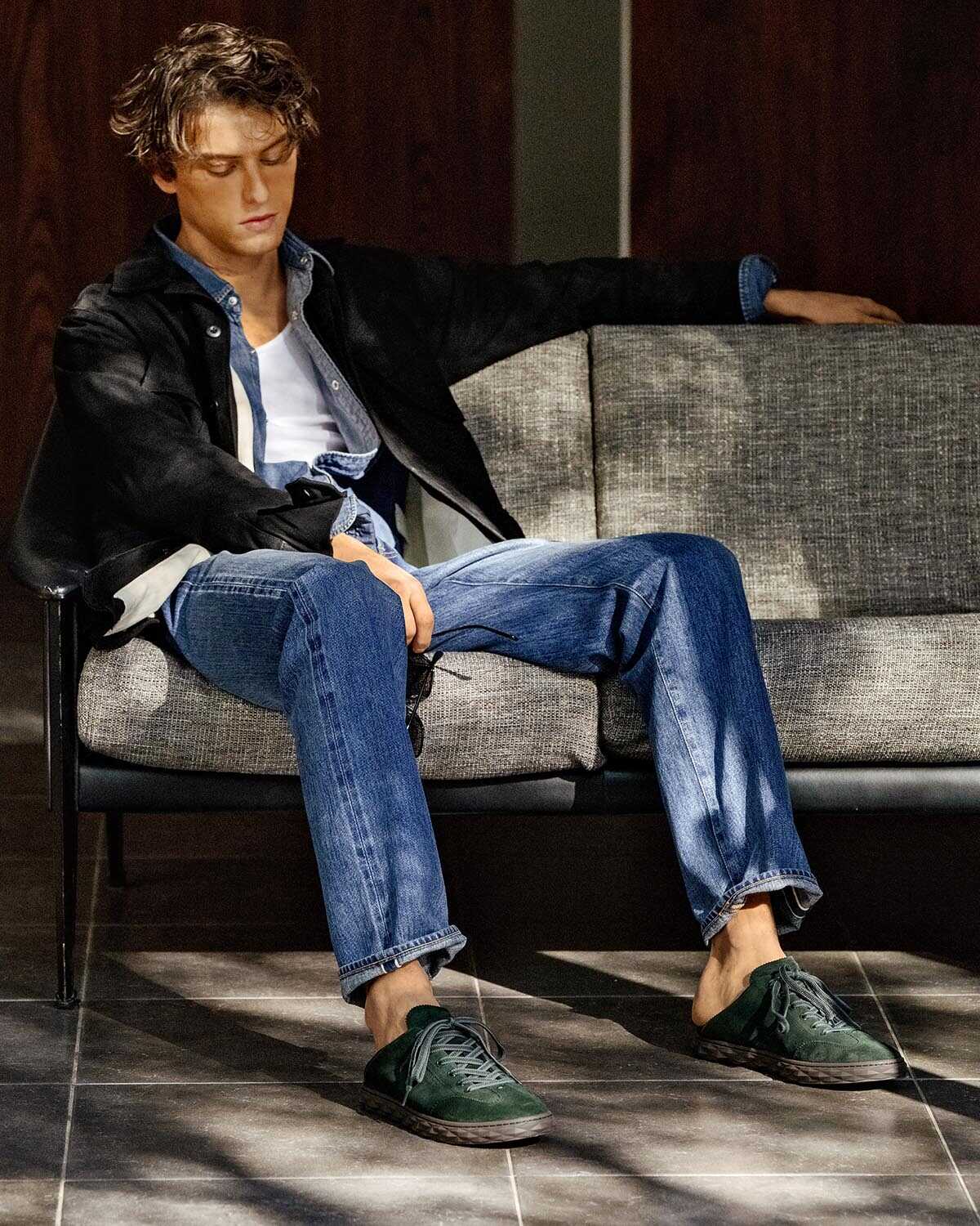 スウェードアッパーのスニーカー“ダイヤモンド フレックス”が、飾らない雰囲気のスウェードブルゾンを品よく引き立てた着こなし。 “ダイヤモンド フレックス”はステップダウンできる1足だけに、あえて踵を倒して履くことで、デニムコーデ特有の気取らないムードを魅力的に見せられるところも魅力。肩の力を抜きつつ、大人らしさを感じるスタイルにブラッシュアップしてくれる。