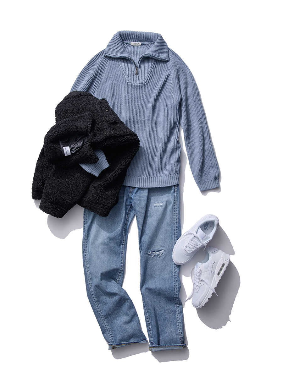 アウター 3万8500円(ダブルピー ウエストポイント/Safari Lounge)、ニット 3万6300円(クロスリー/Safari Lounge)、スニーカー 1万6500円(ナイキ/Safari Lounge)