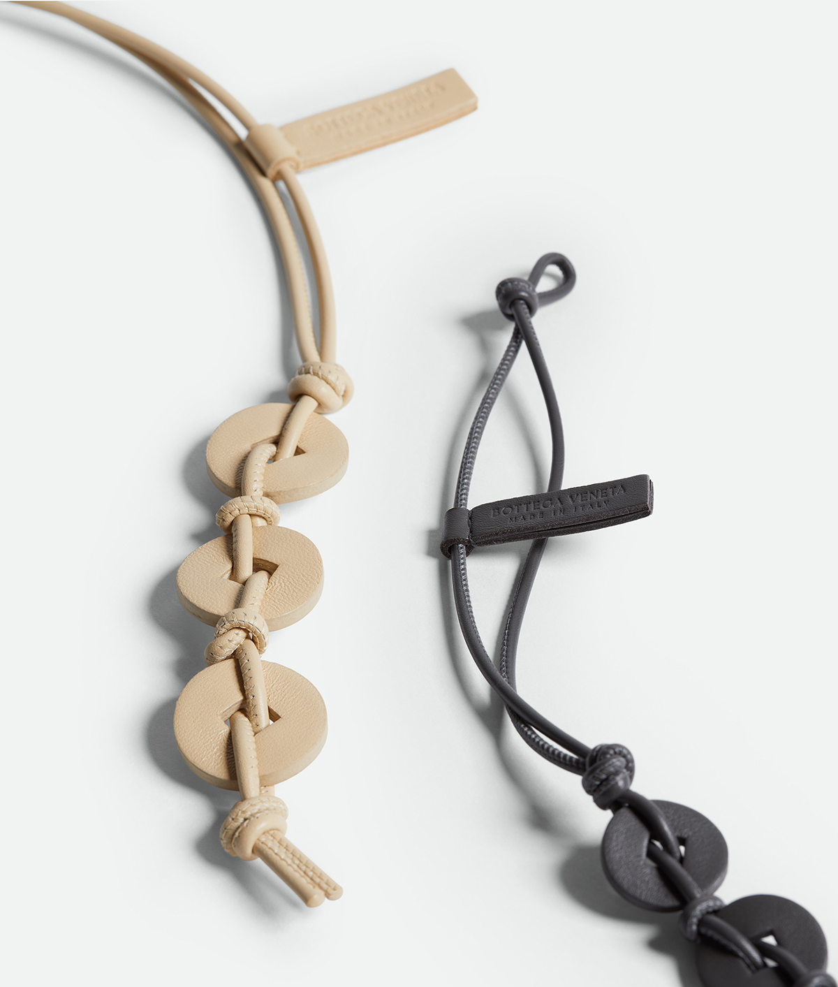 ボッテガ・ヴェネタ公式オンラインストアでは、財布、カードケース、コインパース、および一部のレザーグッズをご購入いただいたお客様に、三つのコインを編み込んでつないだ特製レザーチャームを数量限定でご用意。古代のお守りに着想を得たラッキーコインモチーフは、幸運の象徴としてデザインされている。本作は、モンテベッロのアトリエで生まれた余剰レザーを用い、丁寧に編み上げて仕立てられたもの。新たなはじまりと豊かさへの願いが込められた特別なチャームは、この機会ならではの特典。上の写真のようにバッグのハンドルなどに付ければ、アクセントにもなる。