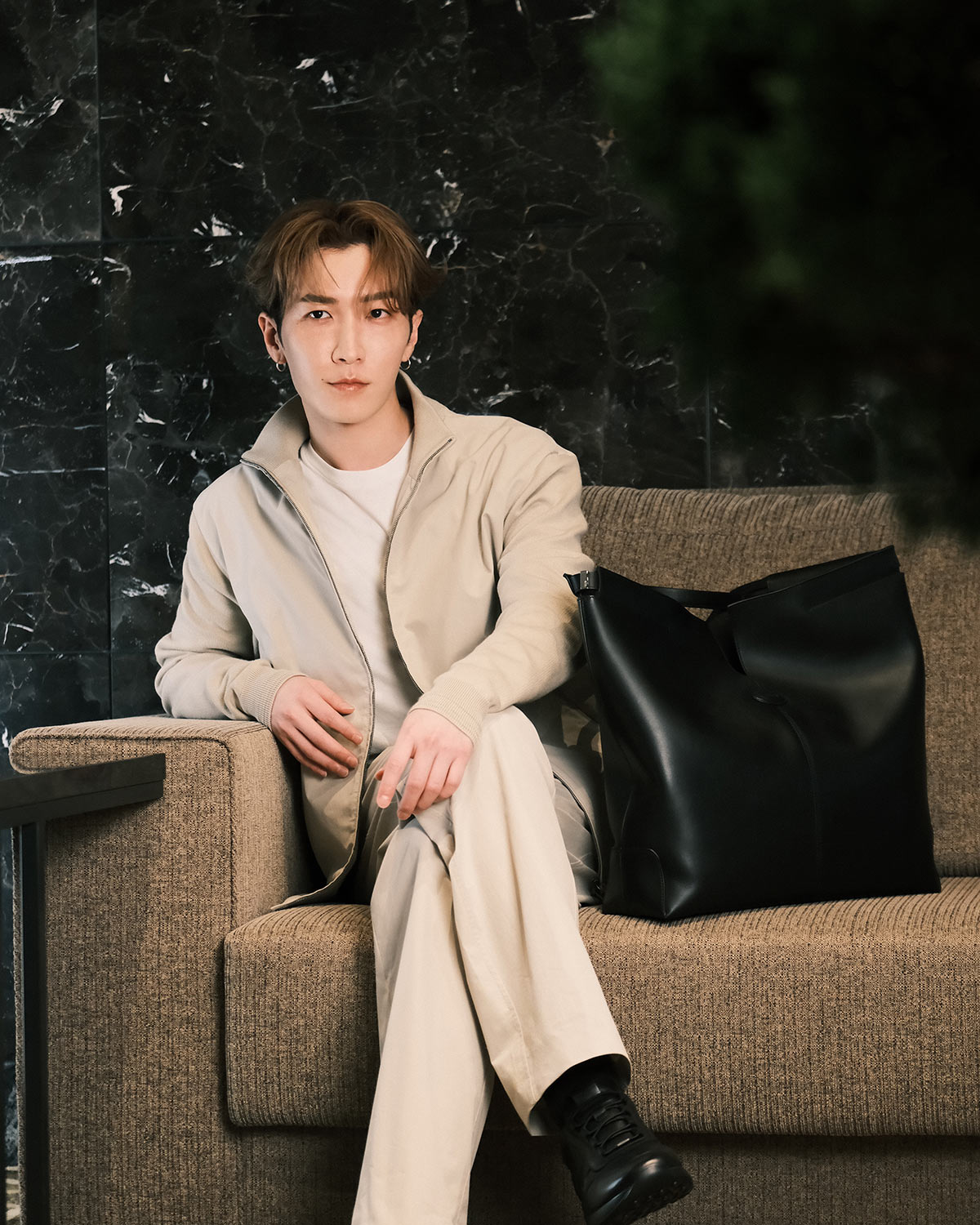 その記念すべき旅立ちのファッションとして選んだのは、コットンベースのテクニカルファブリックとニットを 組み合わせたボンバージャケットに、同素材のテクニカルファブリックで仕立てた ドローストリングスパンツ。清潔感のあるベージュのセットアップスタイルだ。