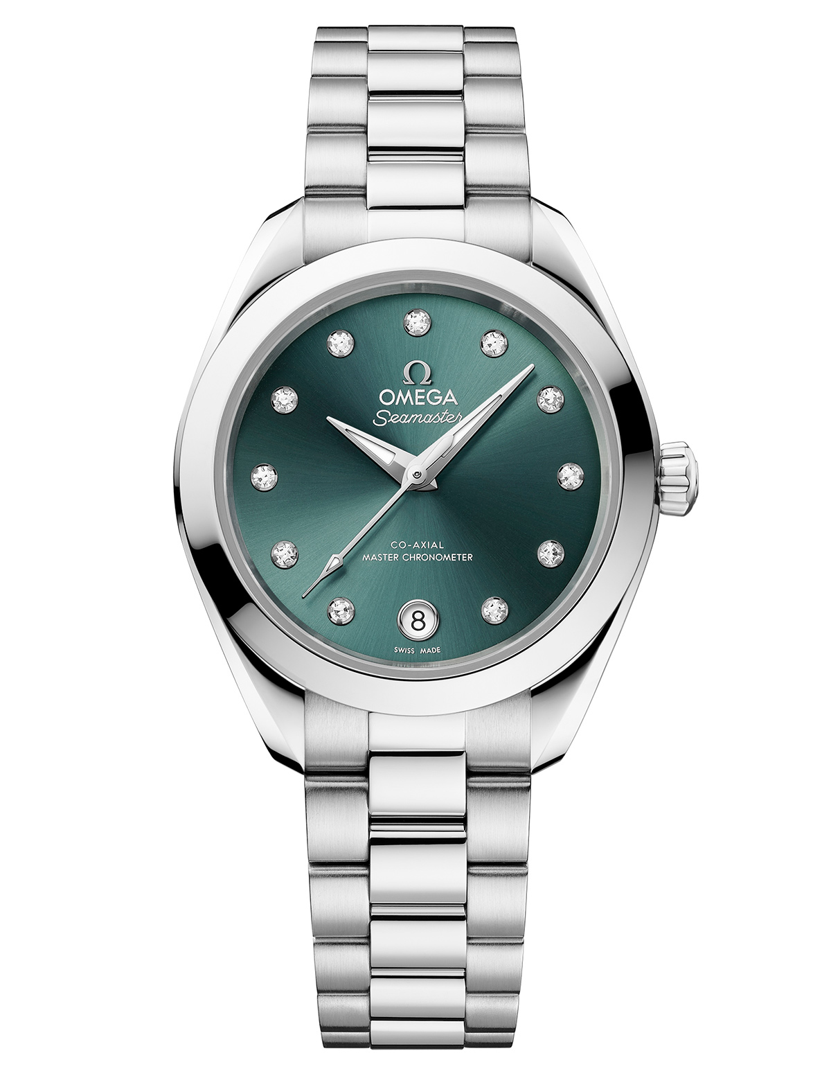〈オメガ〉と海の豊かな歴史にオマージュを捧げるシーマスター アクアテラ。スリムな30mmのこのモデルには、洗練されたスタイルにスイス連邦計量・認定局(METAS)認定の業界最高水準を誇るオメガ の革新的コーアクシャル マスター クロノメーター キャリバー8750を搭載している。またポリッシュ仕上げを施したステンレススチール製のシンメトリーなケースのねじ込み式ケースバックには、波模様が入っている。ダイヤルは色のついたラッカーでパイングリーンにし、サンブラッシュ仕上げを施している。6時位置に丸型の日付窓を備え、それ以外のアワーマーカー位置には11個のダイヤモンドが入っている。アプライドのオメガマークと針はすべて18Kホワイトゴールド製で、針にはブルーの光を放つホワイトのスーパールミノバが塗布されている。