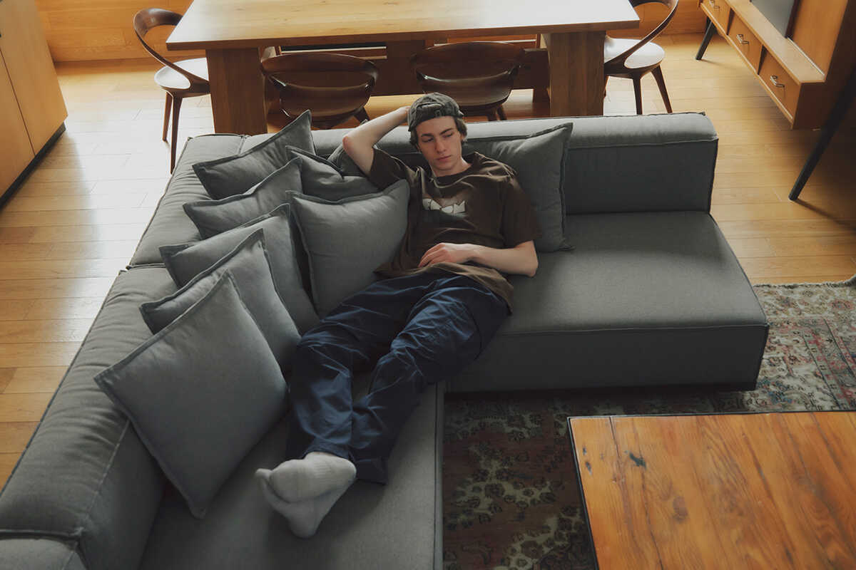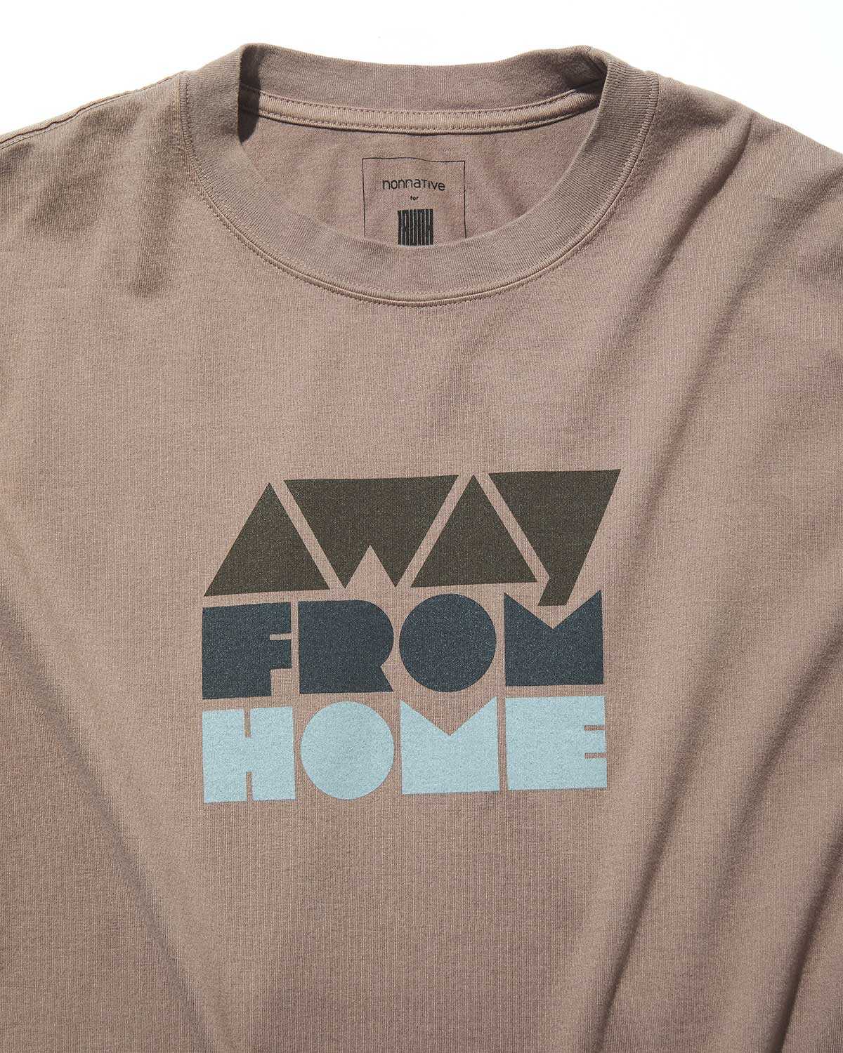 Tシャツは日本製オリジナルボディに"AWAY FROM HOME"のグラフィックプリントと袖に〈ノンネイティブ〉のロゴ刺繍をボディと同色で配し、室内でくつろぐ時間から街へと歩き出す瞬間まで寄り添う1着に仕上げた。カラバリは2色。