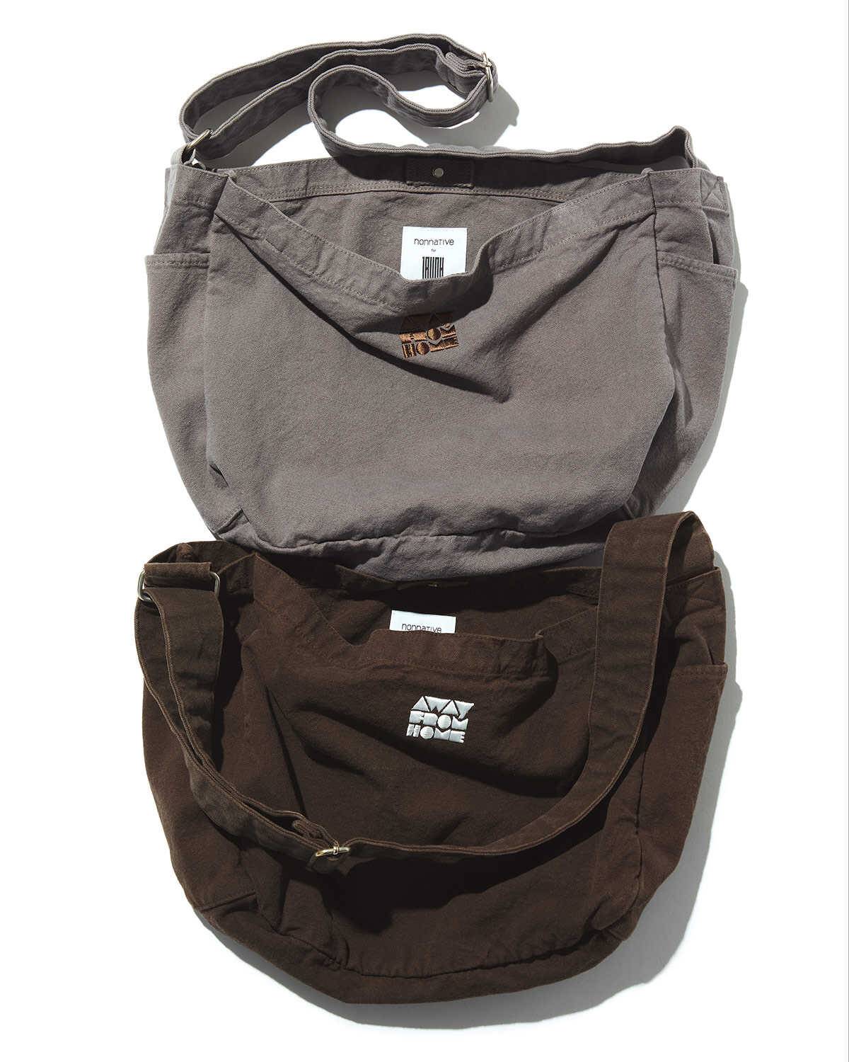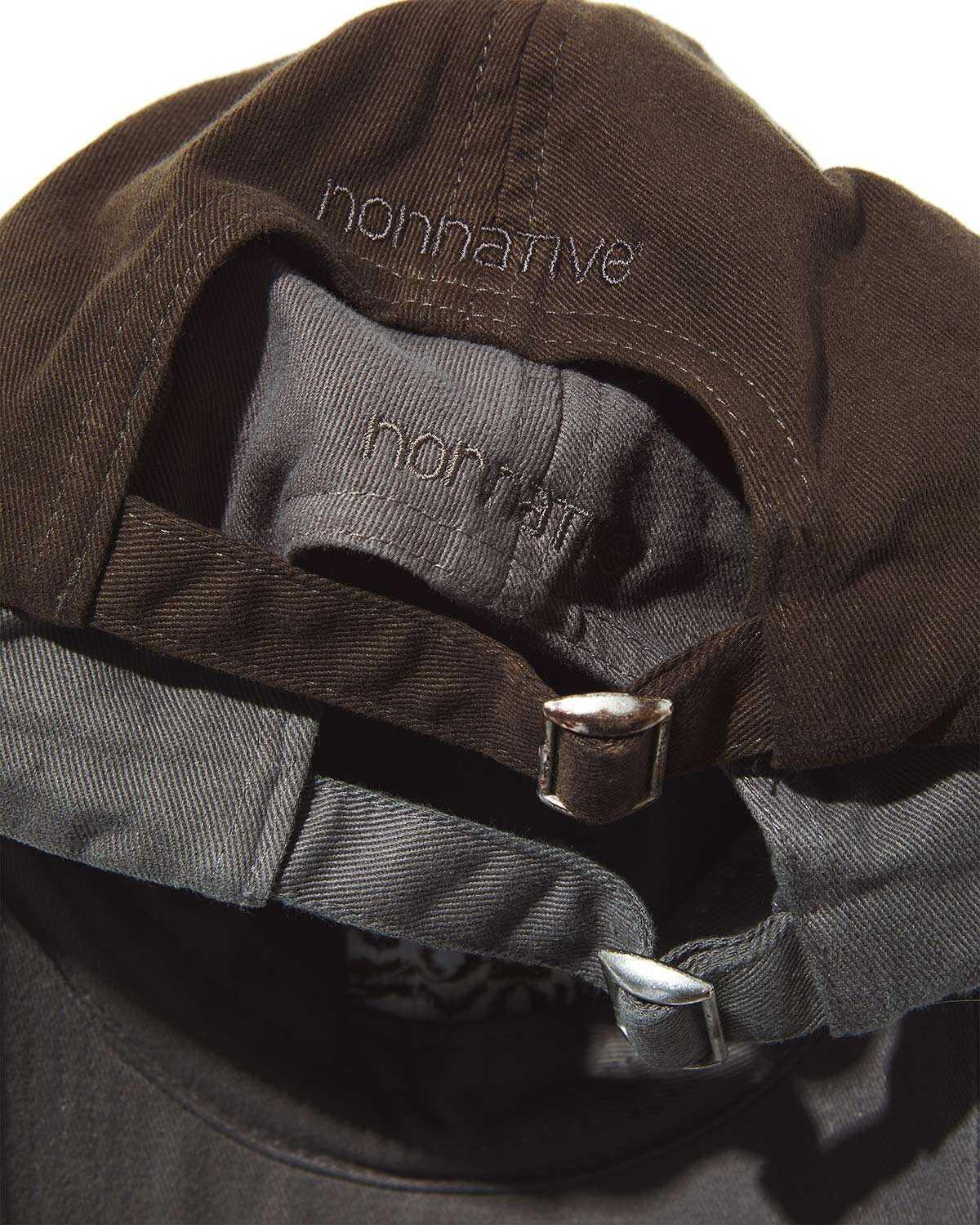 同デザインのキャップは、コットンツイル素材で都市を行き来する日常に溶け込む佇まいになっている。"AWAY FROM HOME"というグラフィックには、家から離れ、旅をして新しい場所や経験へ向かうという意味が込められているそう。日常の場所から一歩離れ、異なる環境に身を置くことで生まれる感覚や変化をイメージしたものだ。その英字はベースカラーとコントラストとなる色が選ばれている。背面にはアジャスターが付き、同色で〈ノンネイティブ〉の刺繍が入っている。