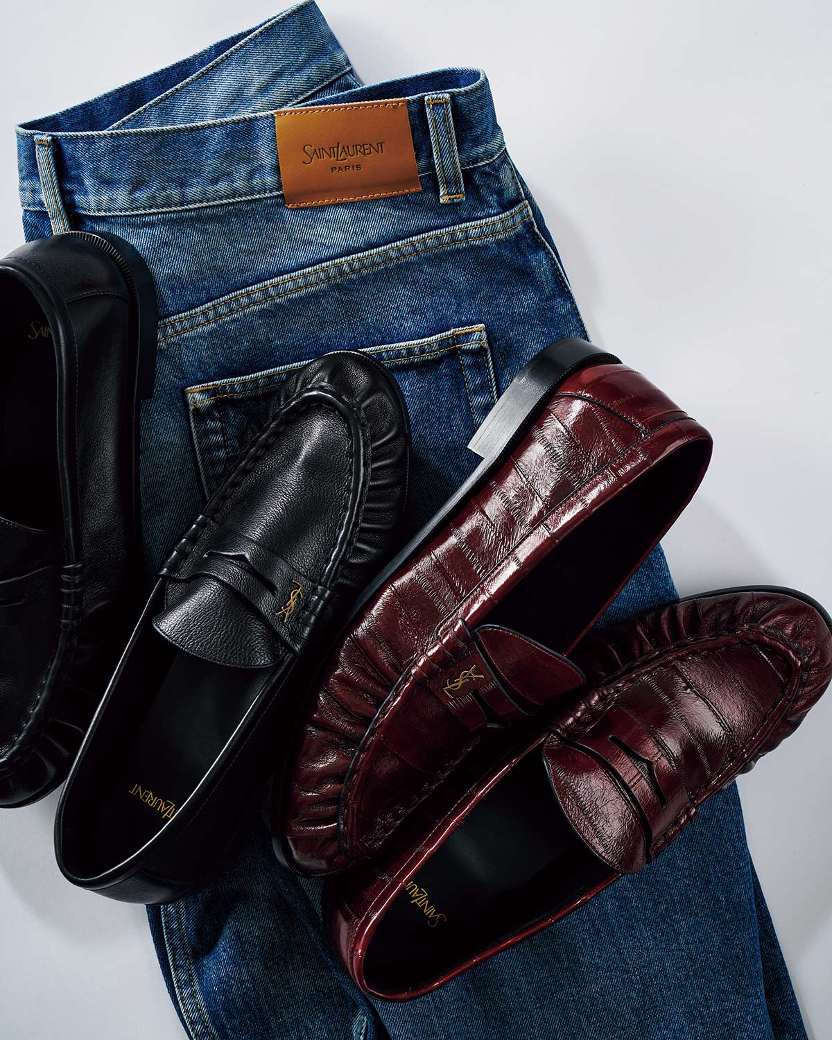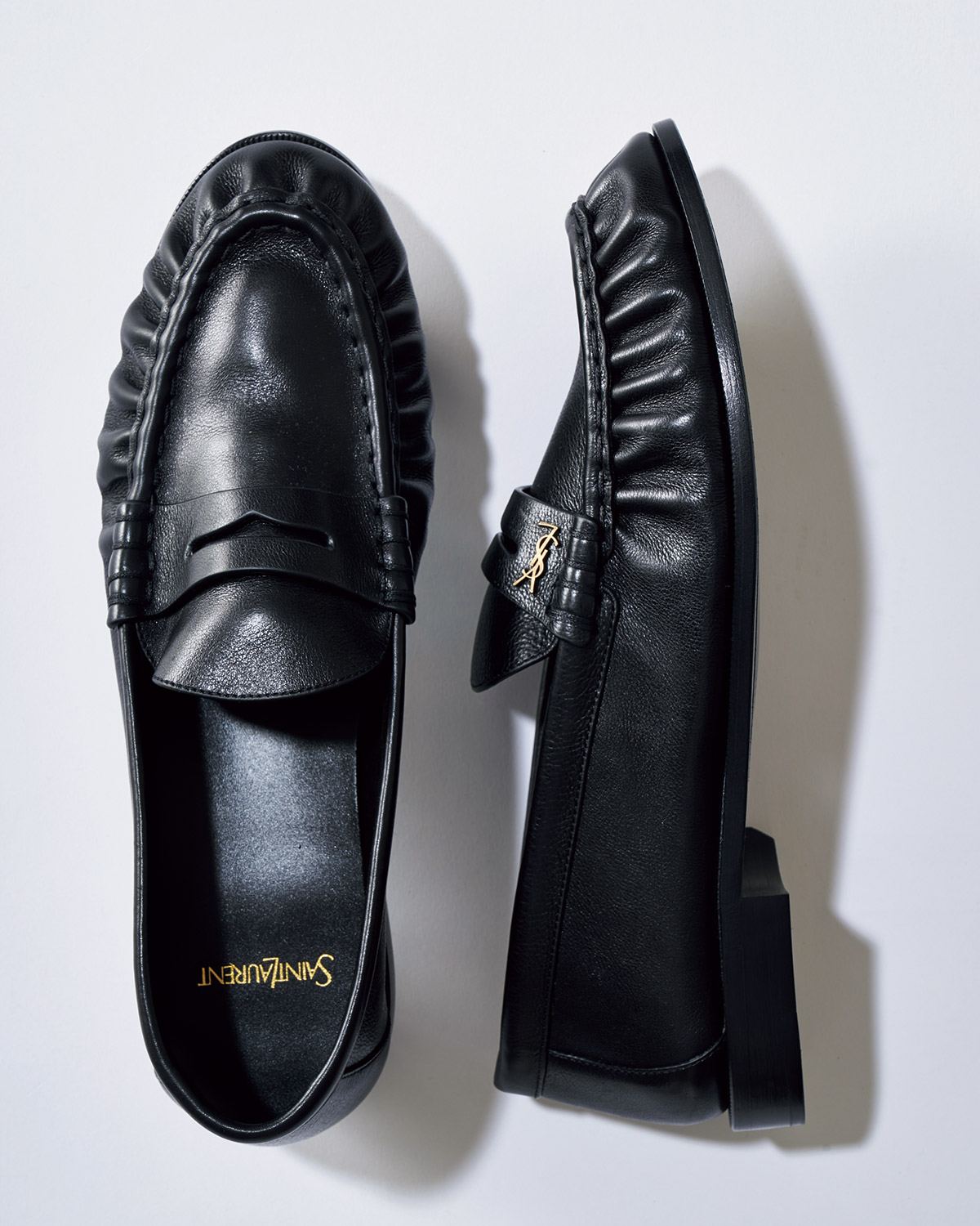 上と同じ仕様のローファーも、黒革ならさらにシックな印象に。甲部は非常に柔らかな作りで、足に優しくフィット。17万6000円(サンローラン バイ アンソニー・ヴァカレロ/サンローラン クライアントサービス)