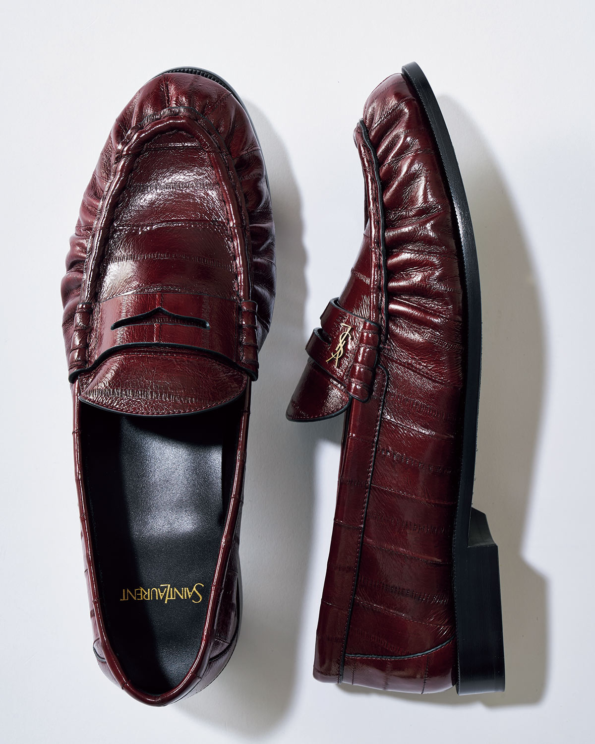 ギャザーが施されたイールスキンに、ボルドーが品よく映える1足。サドルの"YSL"モノグラムは、格上感ある金メタル。21万4500円(サンローラン バイ アンソニー・ヴァカレロ/サンローランクライアントサービス)