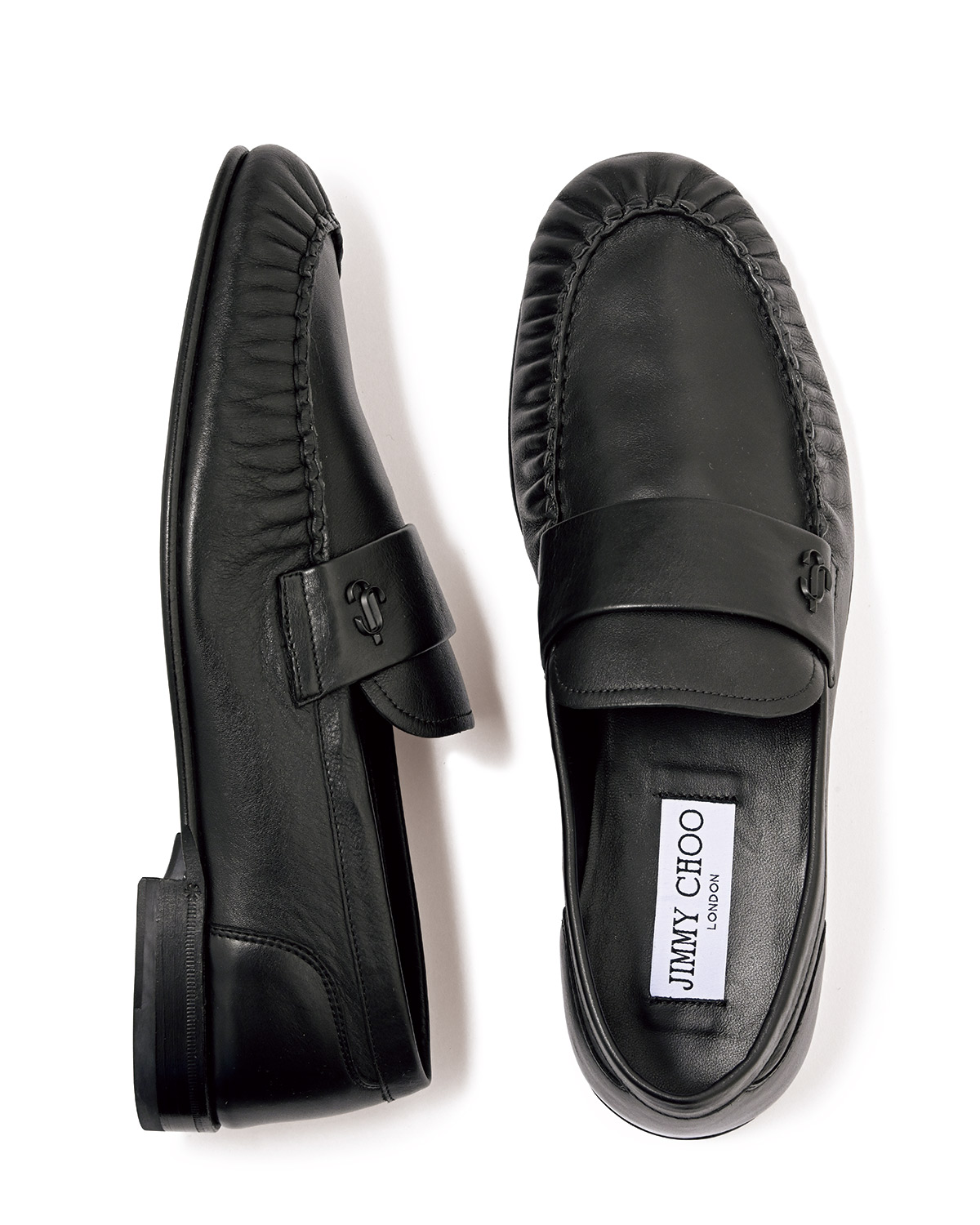 ギャザーの美しさから、革の柔らかさときめ細かさが伝わる"エリス ローファー"。同色で馴染ませた"JC"エンブレムが、控えめゆえに感じる品格のアピールにひと役買ってくれる。14万800円(ジミー チュウ)