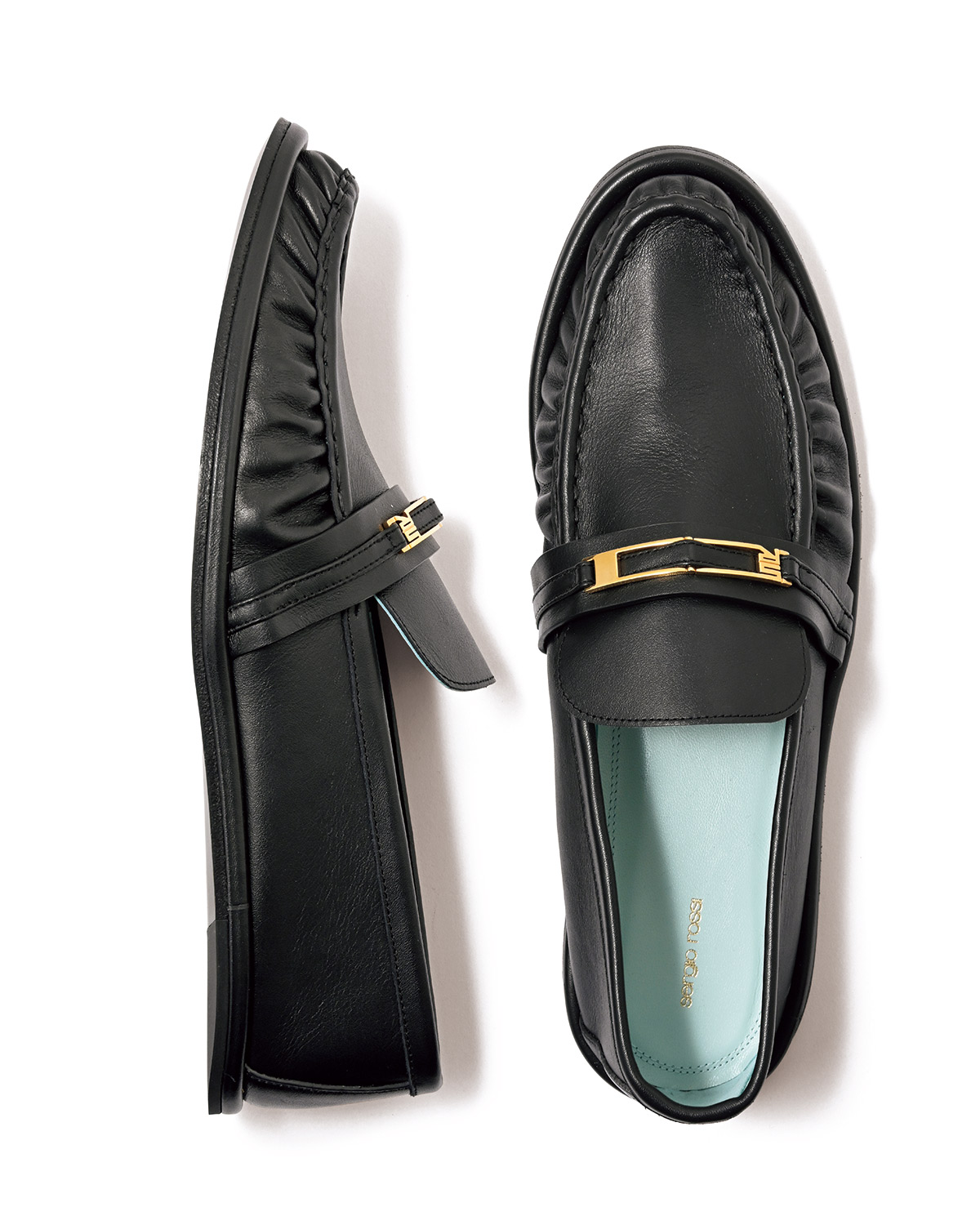 モノグラムをあしらった金具が、足元に華やかさをもたらすビットローファー。靴底にまで至るストラップが、横顔のアクセントに。13万900円(セルジオ ロッシ/セルジオ ロッシ ジャパン カスタマーサービス)