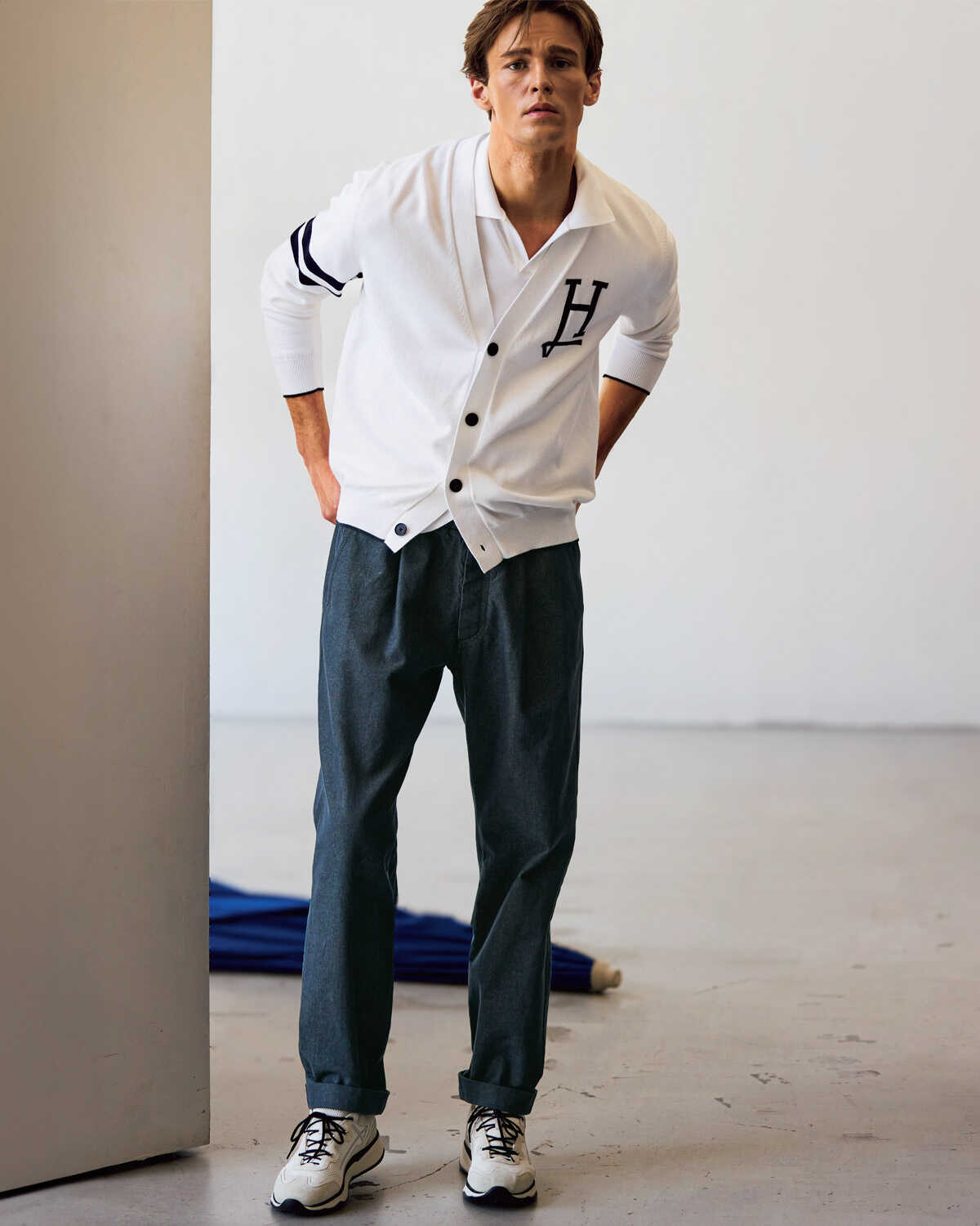 爽やかな着心地のスキッパーポロに、胸の“H”モノグラムや腕のライン使いがスポーティなカーディガンを重ねた春らしい重ね着。ボトムにタック入りのデニムパンツを合わせることで、大人っぽく落ち着いた印象に。デニムパンツは、太腿まわりにほどよい余裕をもたせつつ、太すぎず細すぎない上品なシルエットなのが特徴。春らしく軽やかに穿きこなせる1本は大人だからこそ似合うはず。カーディガン9万3500円、スキッパーシャツ4万6200円、タック入りデニムパンツ6万9300円、スニーカー9万6800円(以上ヘルノ/ヘルノ・ジャパン)