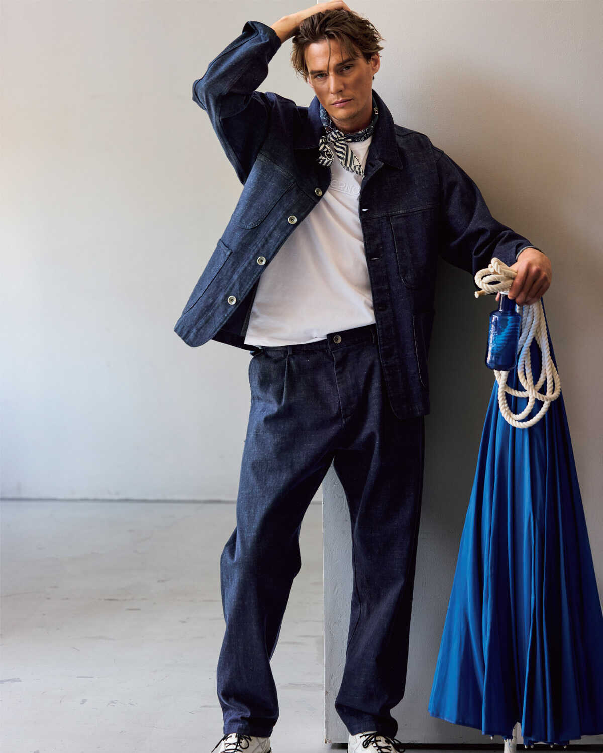 ワークの匂いをほんのり感じさせるカバーオール風ジャケットに、タック入りのパンツを合わせた大人のデニム・オン・デニムスタイル。ジャケットは大きめのメタルボタンが着こなしの絶妙なアクセント。パンツはストレッチ入りで動きやすく、リラックスしたシルエットが春らしい。白Tの首元にはバンダナを巻いて、さりげなく上品な週末カジュアルにまとめるのがおすすめだ。デニムジャケット13万6400円、Tシャツ2万9700円、デニムパンツ6万4900円、バンダナ1万9800円、スニーカー9万6800円(以上ヘルノ/ヘルノ・ジャパン)