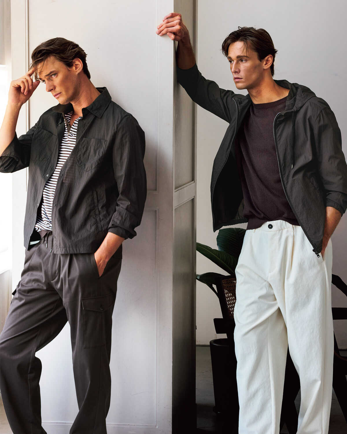 ともに軽快な撥水ナイロンブルゾンを軸にした、大人のスポーティスタイル。ニット系の上品インナーを取り入れつつ、リラックスしたシルエットのボトムを合わせて、肩の力が抜けた柔らかい雰囲気の着こなしがこちら。ナイロンブルゾンがチョコ茶系の落ち着いた色合いで、スポーティになりすぎず大人っぽく着こなせるのがポイント。どこかに白を取り入れて、爽やかな抜け感を加えたい。右:ブルゾン13万7500円、ニット7万1500円、パンツ6万9300円 左: ブルゾン12万9800円、ニットポロ7万9200円、カーゴパンツ8万3600円(以上ヘルノ/ヘルノ・ジャパン)