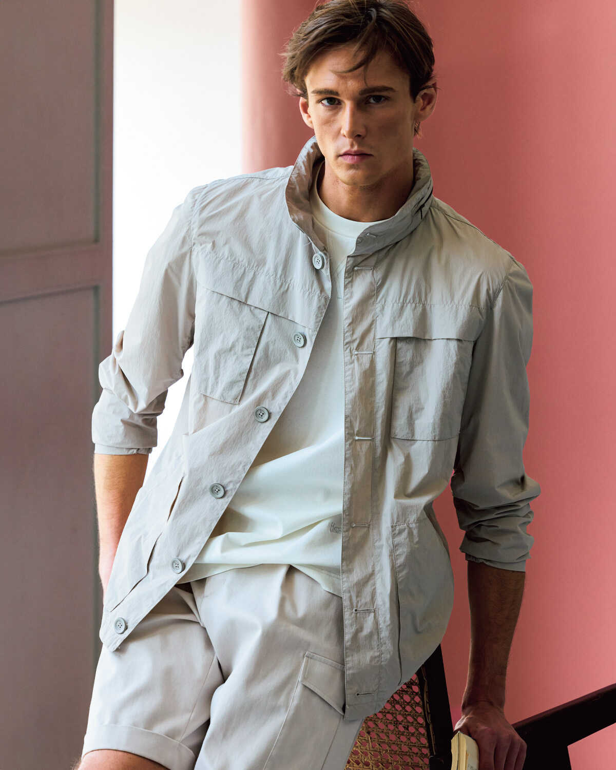 コンサバっぽく見えがちなグレーも、〈ヘルノ〉ならしっかり大人っぽく新鮮にアレンジできる。たとえば、武骨なイメージのある定番のフィールドジャケット。これもニュアンスのあるアイボリーカラーや、すっきりとしたデザインの効果により、ぐっと洗練された印象に。白T、ライトグレーのカーゴショーツと、全体のトーンを微妙にずらして重ねることで、奥行き感のあるワントーンコーデになっている。なにより、立ち襟が男らしい! フィールドジャケット14万1900円、Tシャツ2万9700円、カーゴショーツ7万2600円(以上ヘルノ/ヘルノ・ジャパン)