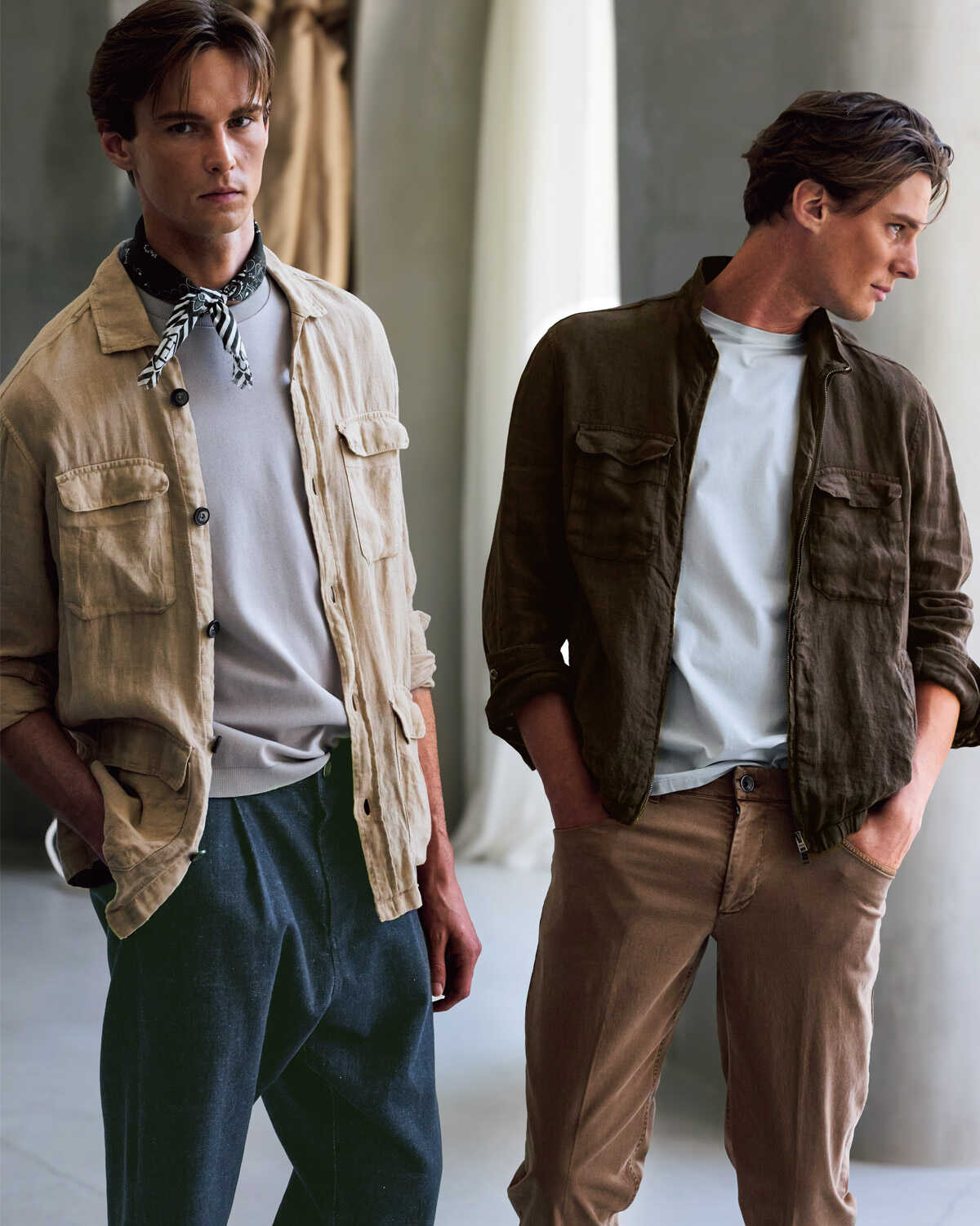くったりとした素材感が味わい深いリネンを使用した、右のモデルが着用したジップアップブルゾンと左のシャツジャケット。ともにガーメントダイによるニュアンスのある色合いが特徴で、週末の着こなしにふさわしいリラックスした表情。右はシルク混のストレッチパンツ、左はストレッチ入りのデニムパンツで、断然大人っぽい。右:リネンブルゾン9万9000円、Tシャツ3万6300円、パンツ6万4900円 左:リネンシャツジャケット9万3500円、ニットTシャツ3万9600円、デニムパンツ6万4900円、バンダナ1万9800円(以上ヘルノ/ヘルノ・ジャパン)