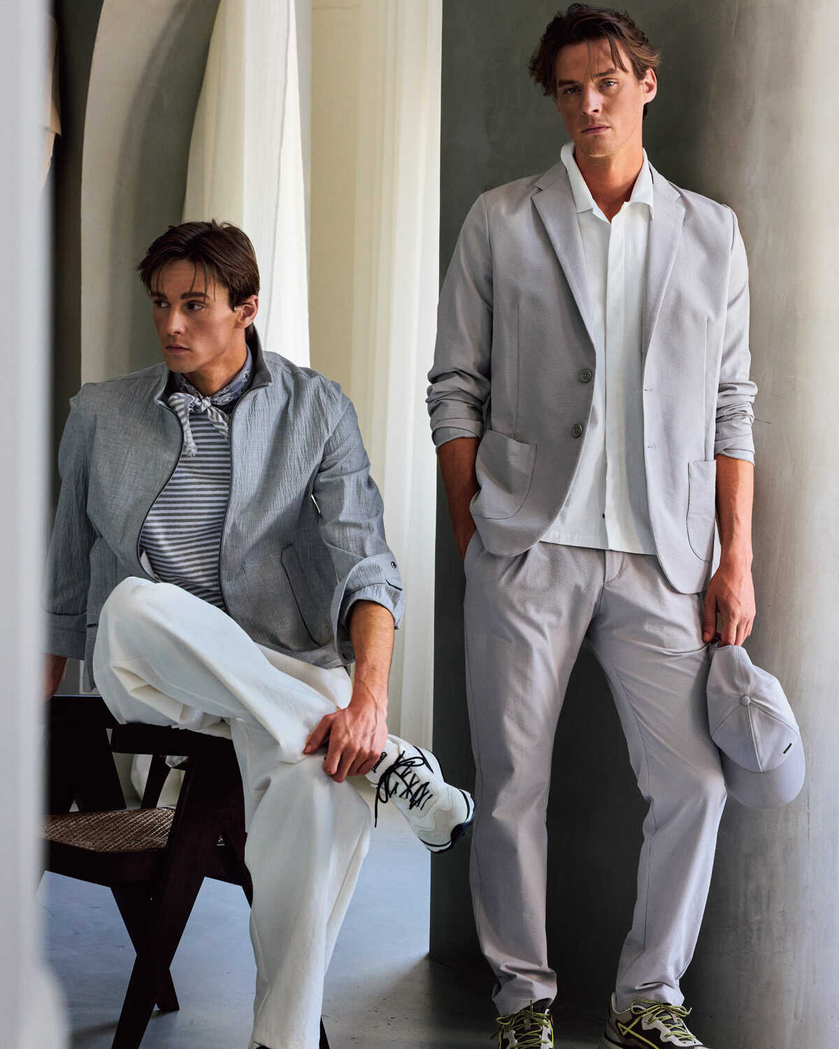 春夏の服選びにおいて、生地の肌触りや快適さは重要なポイント。〈ヘルノ〉の新作では、リネンやシアサッカーといった春夏素材を使い、大人っぽくリラックスした雰囲気にアレンジ。心地いい肌触りと涼しげな着心地が楽しめるはずだ。
