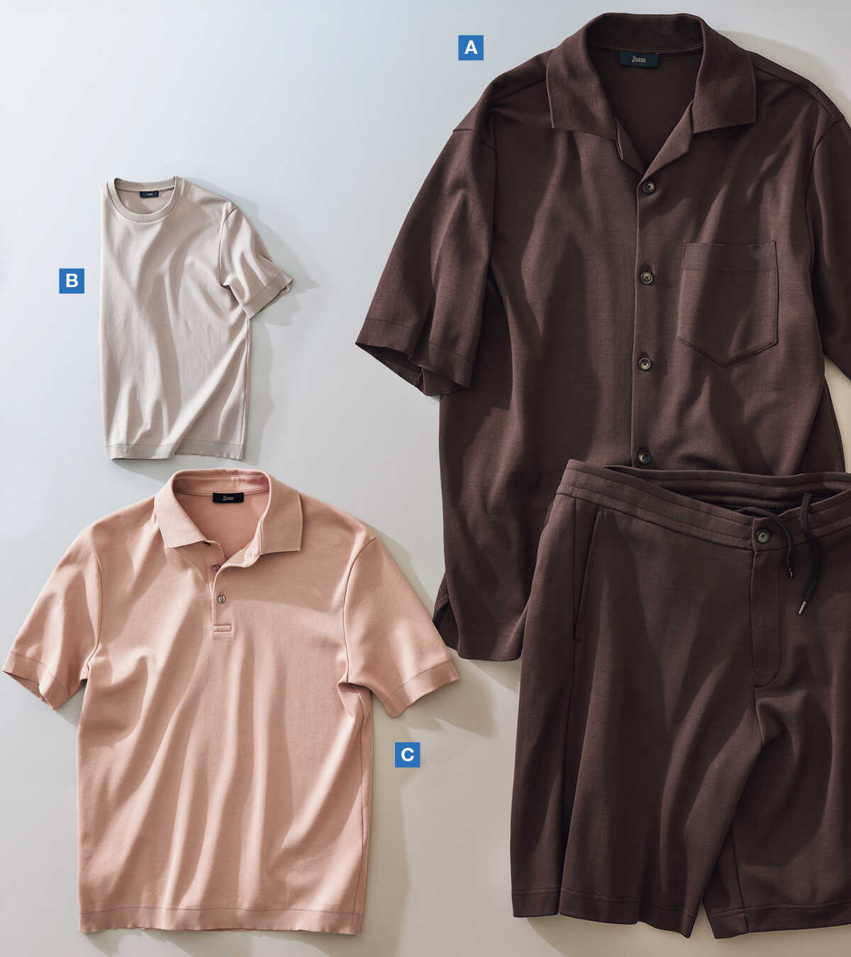 A:シリーズから待望の半袖&ショーツのセットアップが登場。開襟のデザインや、茶の色合いが落ち着いた大人の雰囲気。半袖シャツ5万9400円、ショーツ5万9400円 B:人気モデルのベーシックTは、袖や裾をリブ編みで切り替えた上質感のあるデザイン。イン使いにはもちろん、1枚で着てもしっかりサマになる。3万9600円 C:なめらかな肌触りが心地いいポロシャツ。今期の新色は淡ピンクの色合いが春らしさ満点で、カジュアルな週末スタイルに上品な雰囲気を加えてくれる。4万6200円(以上ヘルノ/ヘルノ・ジャパン)