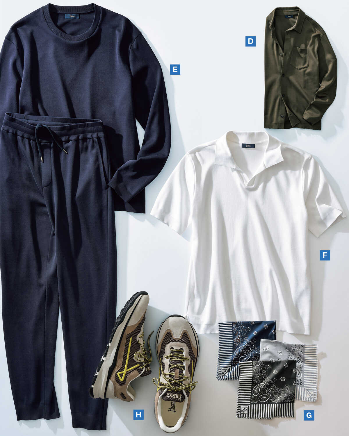 D:テロっとした柔らかさが魅力のロングスリーブシャツ。落ち着いたカーキの色合いで、男らしくも上品な佇まい。6万4900円 E:ニット見えする上質感と、ジャージならではの軽やかさを兼ね備えたセットアップ。リラックスして過ごす週末にぴったり。ロングスリーブTシャツ4万2900円、パンツ6万4900円 F:マリンな香りが漂う、爽やかなルックスのスキッパーシャツ。春から夏まで、Tシャツ代わりに着こなしたい。4万6200円 G:ペイズリー柄と、四隅に“H”モノグラムをあしらった、使い勝手抜群のバンダナ。Tシャツの首元に巻いたり、パンツのバックポケットに差したりと、使い方はアイデア次第。各1万9800円 H:爽やかなメッシュのディテールと、サイドの立体的な刺繍が特徴的な定番スニーカー“ヘルノ マッジョーレ”。歩きやすく柔らかい履き心地が得られるストローベル製法を採用。街で目を引くブラウンとイエローの色合わせも秀逸。9万6800円(以上ヘルノ/ヘルノ・ジャパン)