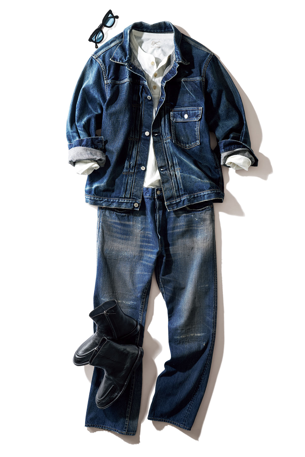 デニムジャケット8万3600円、デニムパンツ8万6900円(以上ロンハーマン デニム/ロンハーマン)、ヘンリーネックTシャツ2万8600円(デンハム/デンハム・ジャパン)、サングラス5万2800円(モスコット/モスコット アオヤマ)、ブーツ20万200円(ピエール アルディ/ピエール アルディ 東京)