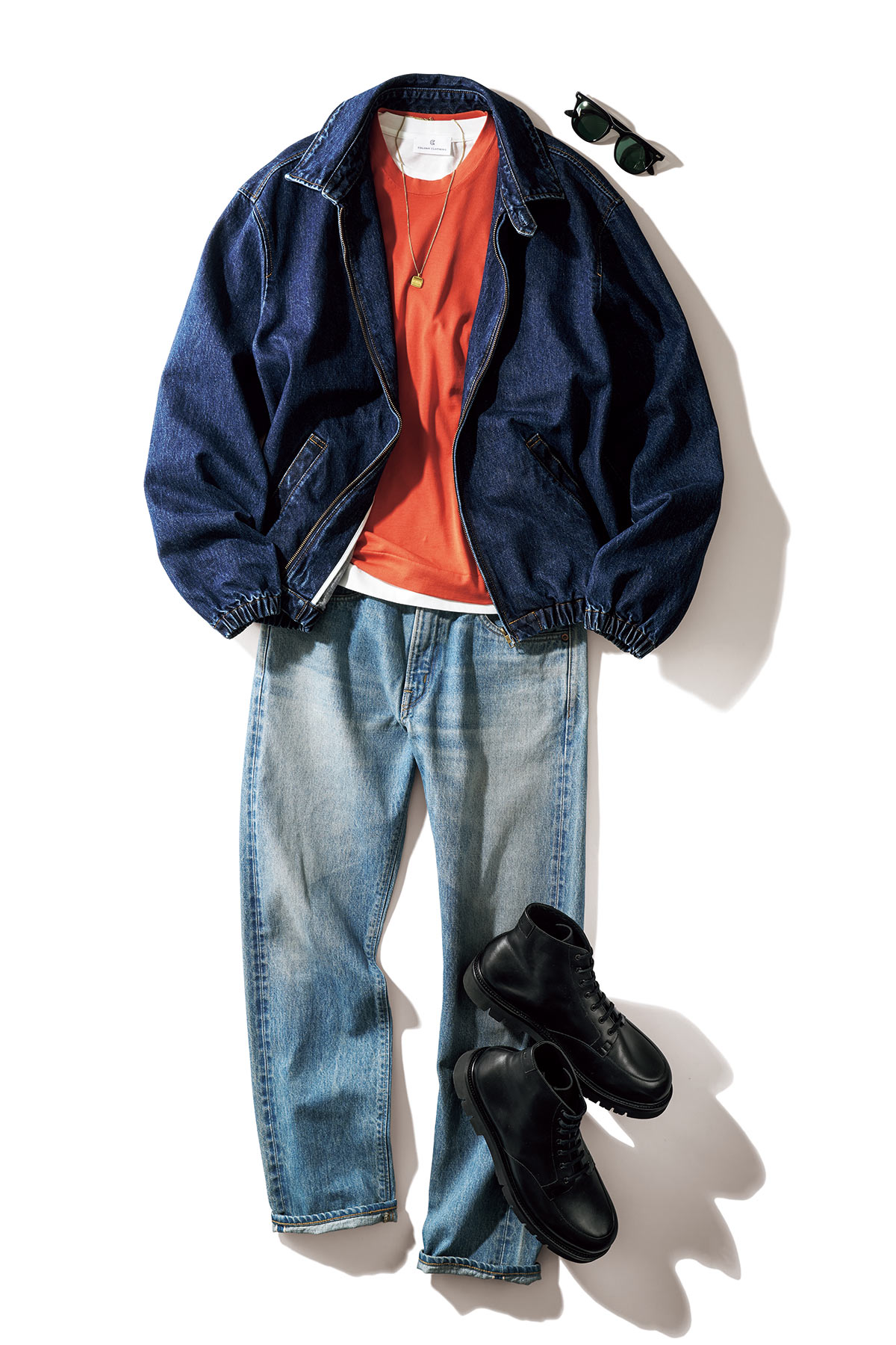 デニム素材のスウィングトップを濃紺にすれば、薄青デニムパンツの清涼感が際立つ。上下の濃淡が強ければ、こんな派手色インナーも合わせやすく、西海岸らしさを出しやすい。